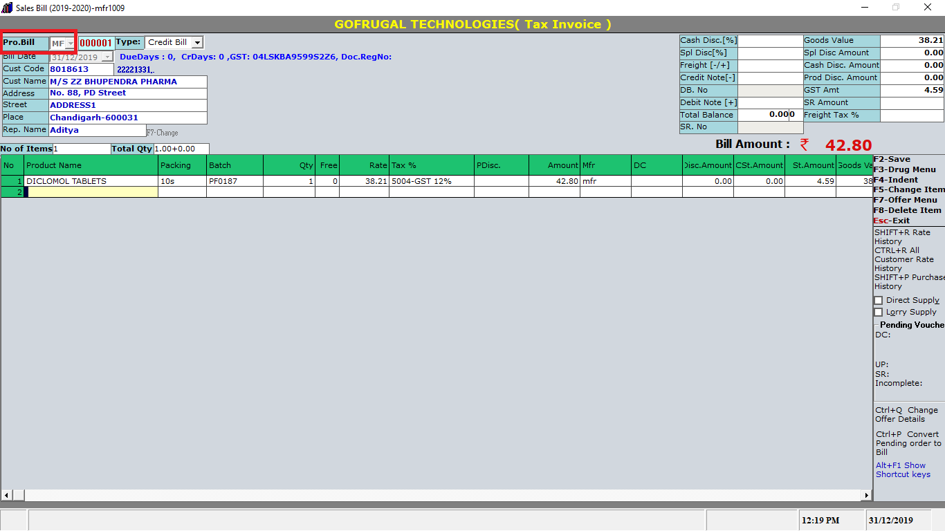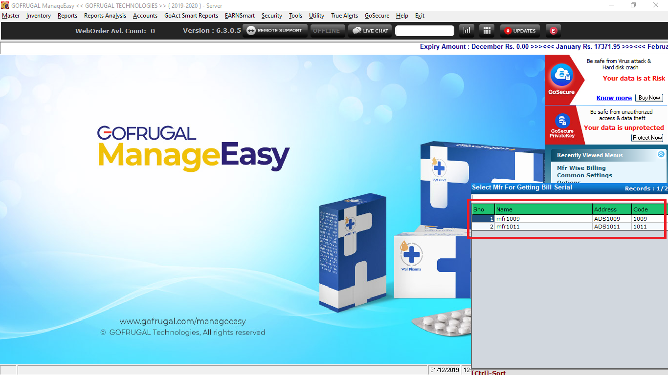 Step 4 : Go to Inventory> Mfr wise transaction> Mfr wise billing .It will list the manufaturer we mapped , we can select the manufaturer and the serial number will be auto selected now we can start billing.
