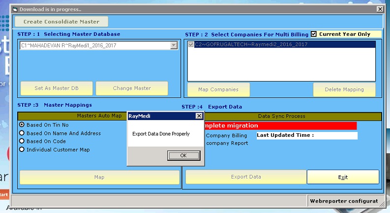 15. Click Export Data and Press yes button start the export both the company data to GOFRUGAL master database.