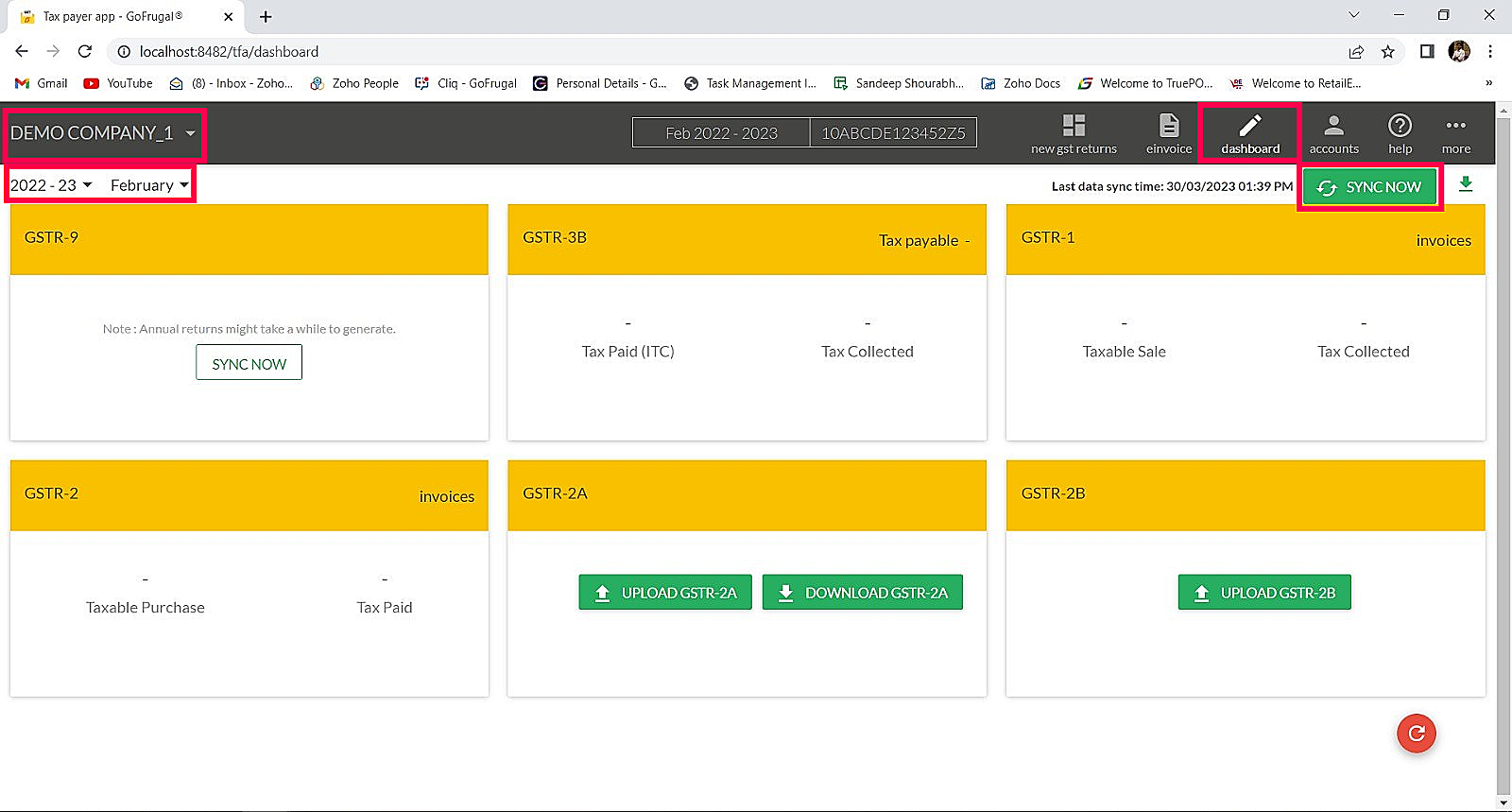 Step 3: Dashboard screen will appear. Here Store Outlet or Company Name and session as period range in terms of month will be listed here. Click Sync Now and proceed to pay for tax.