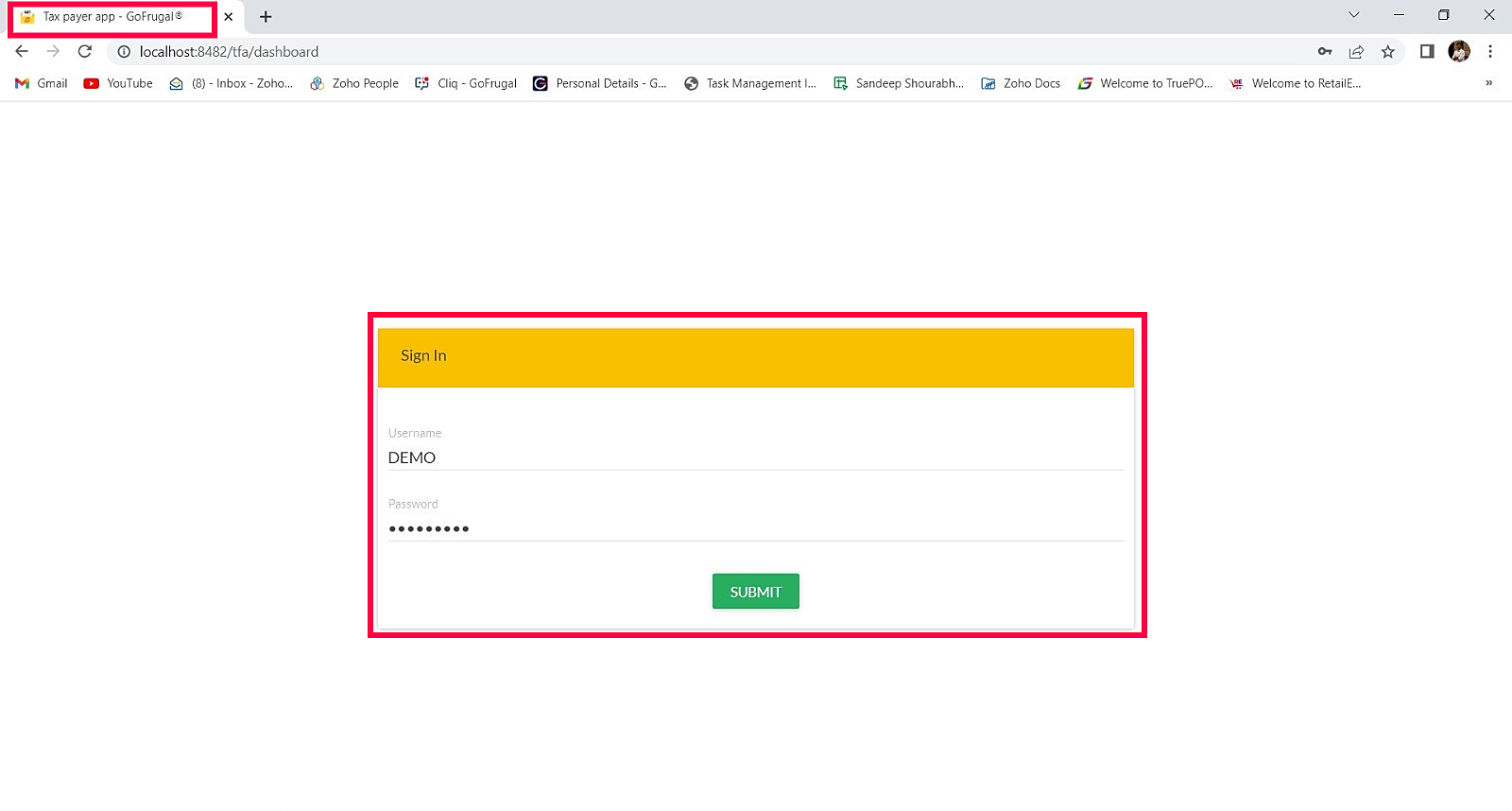 Step 2: Tax Payer app - GoFrugal screen will appear through the new browser URL. Make Log-In with valid credentials.