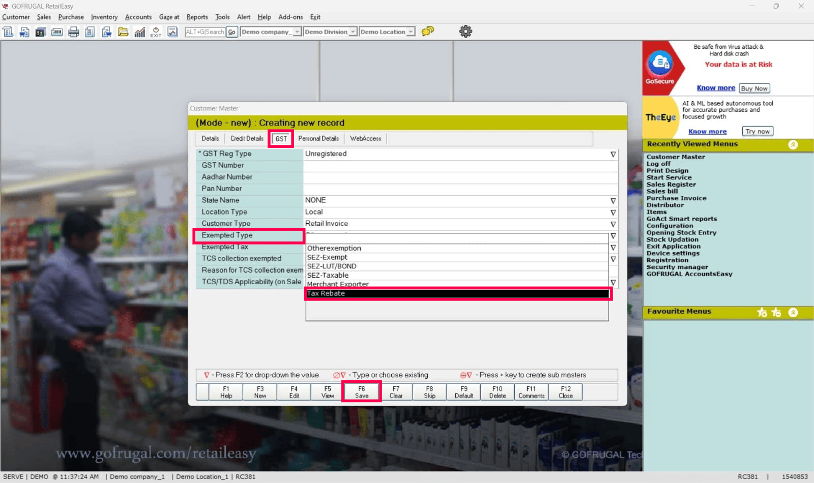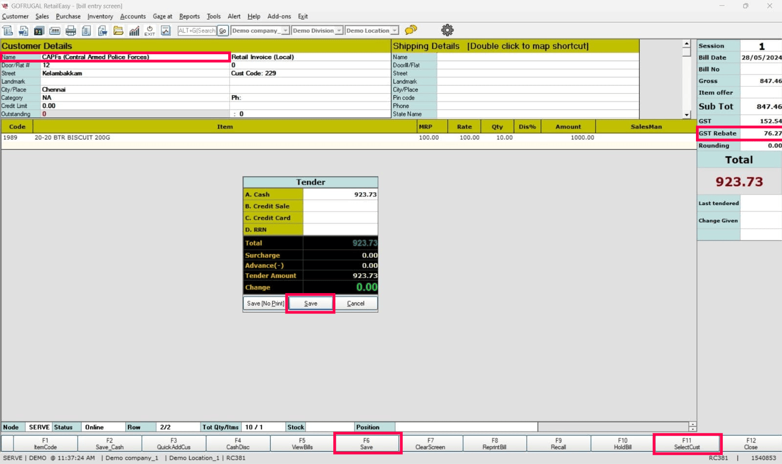 Step 5: Bill Entry Screen will appear. Select the Customer, load items, Verify for GST Rebate. Click Save.