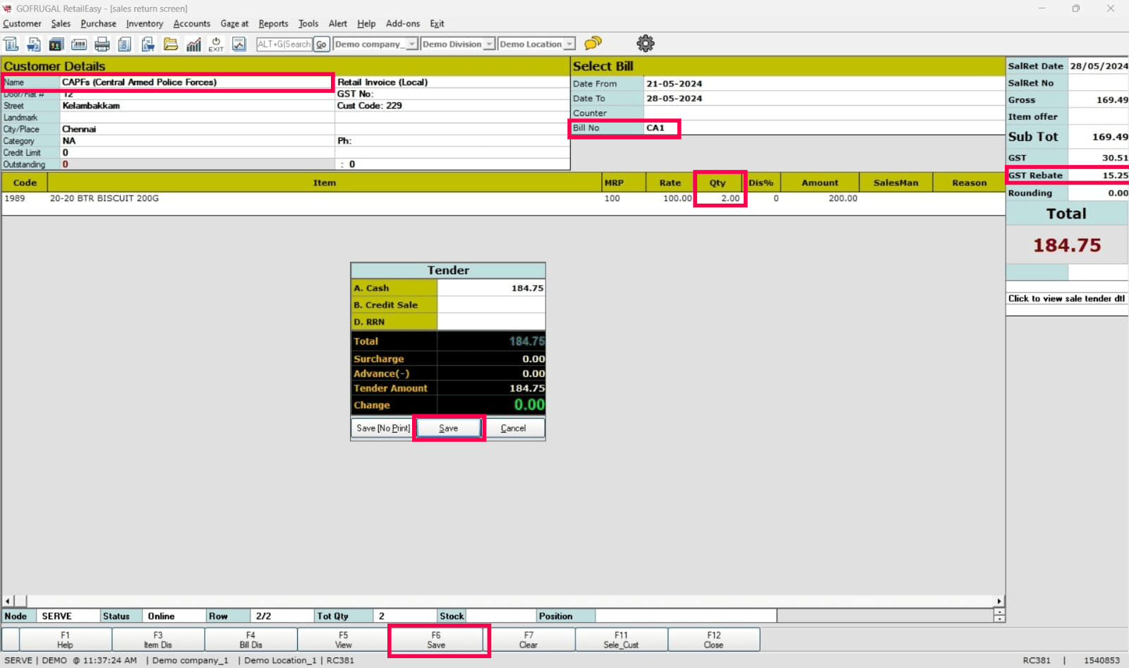 Step 7. Sales Return Screen will appear. Select Customer and load Bill No. > Choose Item Qty. Verify for GST Rebate and Click Save.