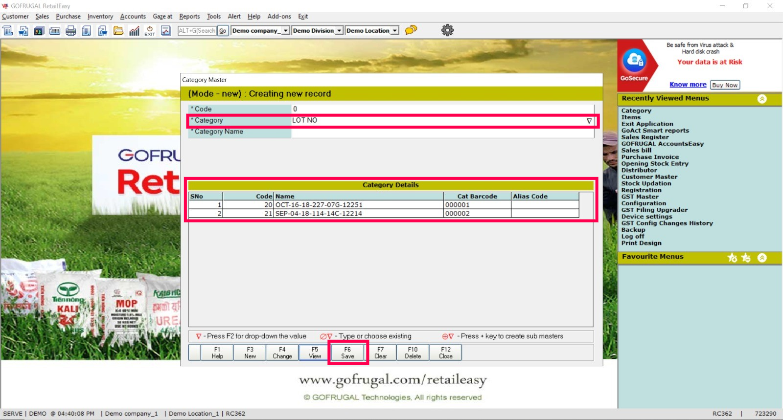 Step 2: Category Master screen will appear. Fill in with details for Category Name. Click Save.