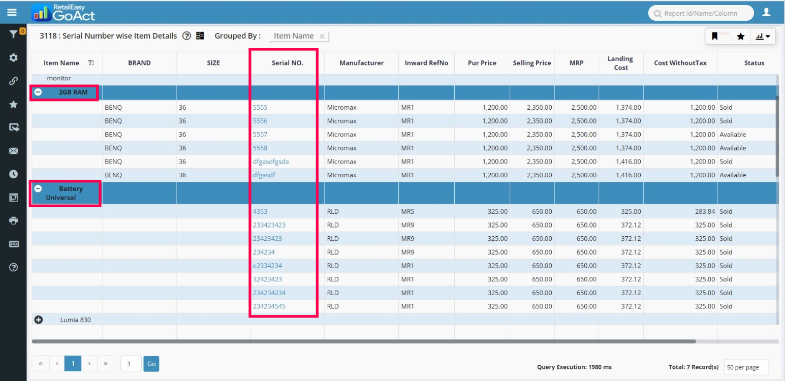 Step 3: Click on (+) sign for respective Item Name. Serial Number will get displayed.