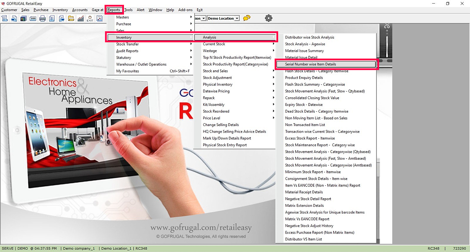 Step1: Go to Reports > Inventory > Analysis > Serial Number Wise Item Details