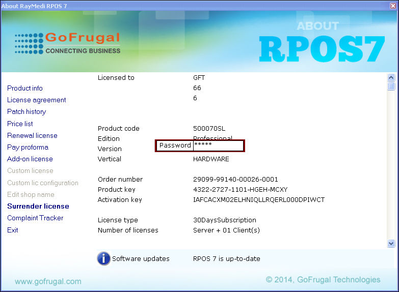 1. Click Help >> About RayMedi RPOS7 to open the Product information screen.