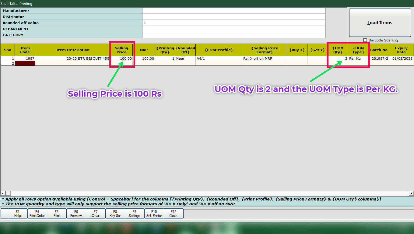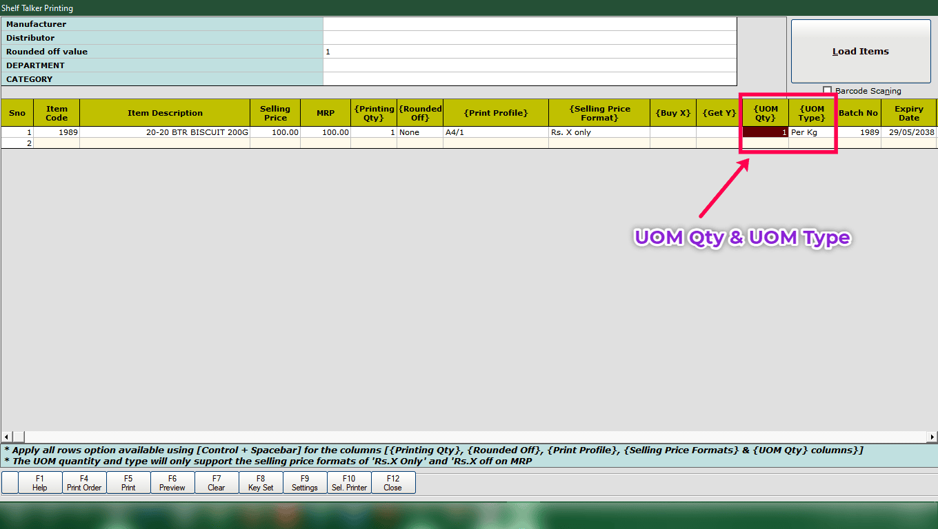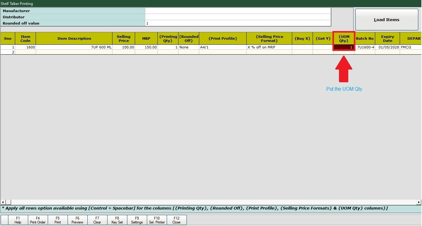 The UOM Qty and UOM Type fields are used to ensure that the correct unit quantity and unit type are reflected in the Shelf Talker print, based on the user’s selection.