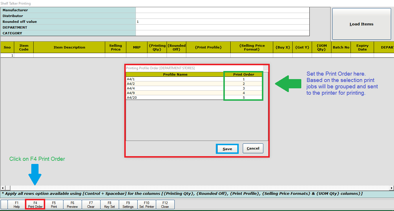 Press the F4 – Print Order button to open the Print Profile Order window, where you can configure the print sequence. The software will group the print jobs based on the defined order.