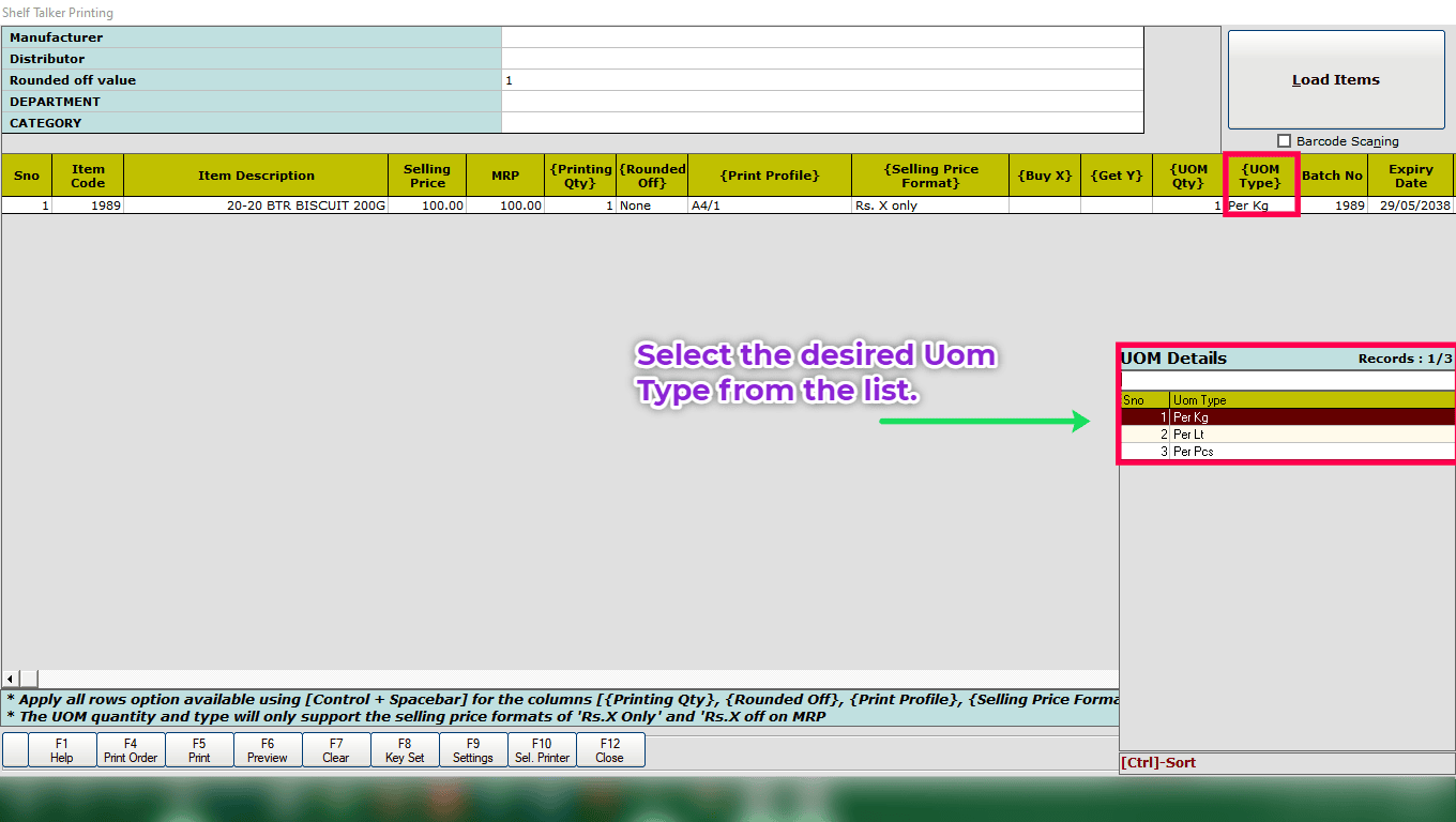 Follow the below steps to generate UOM Type-wise prints in Shelf Talker: