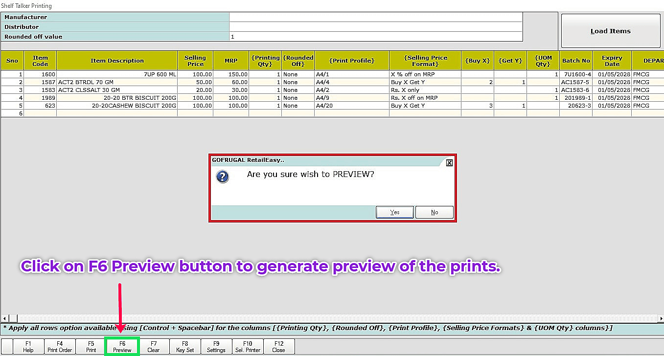 To generate a print preview, press the F6 – Preview button and click Yes to proceed.