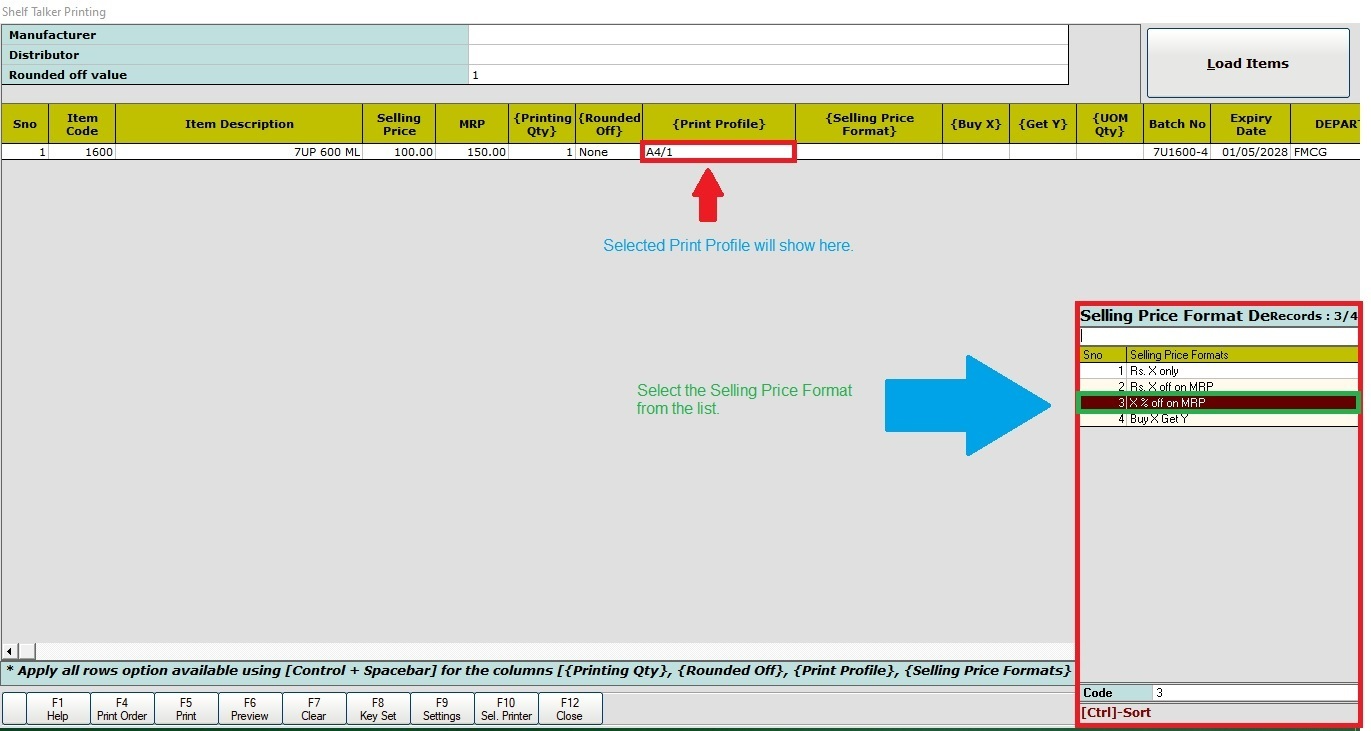 Press Enter button in the Print Profile field to open the selection window and choose the required Selling Price Format.