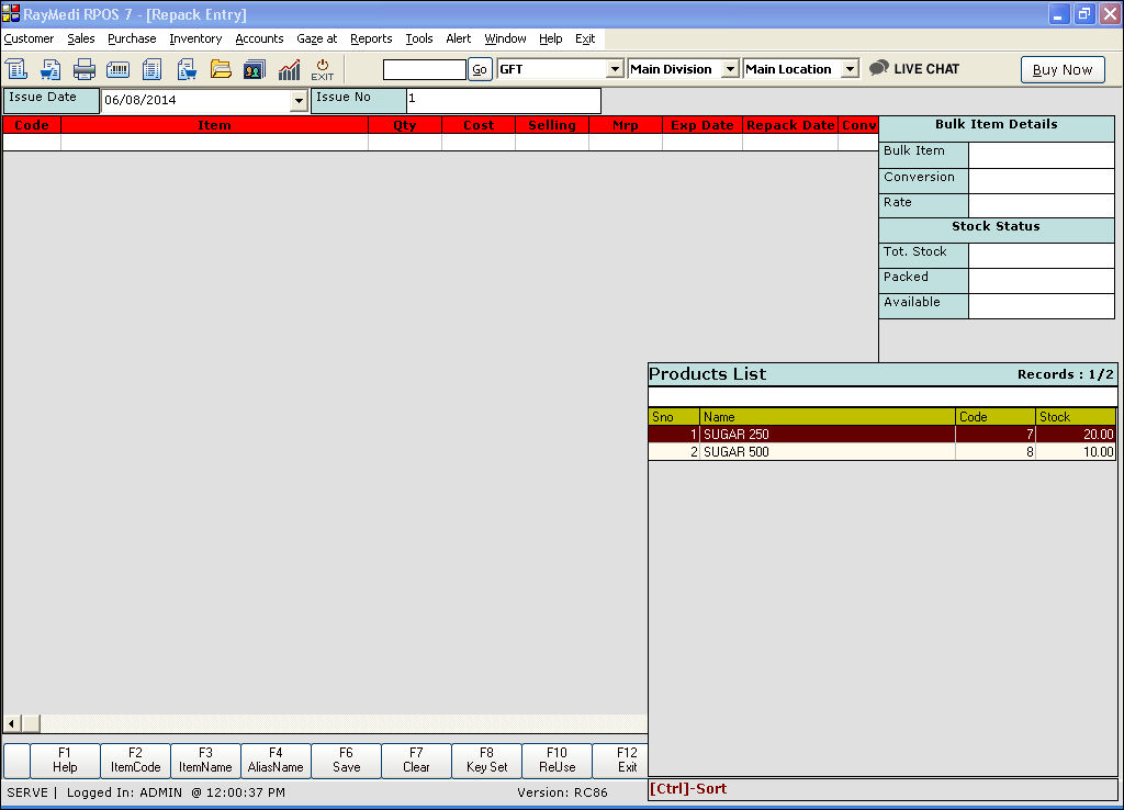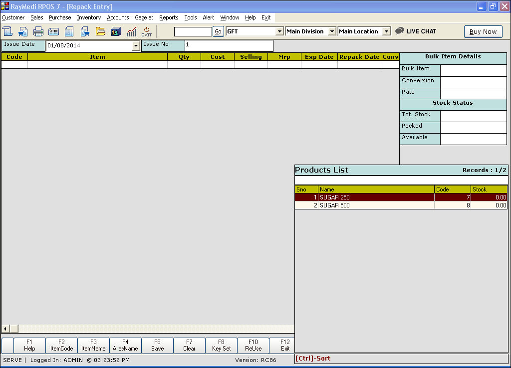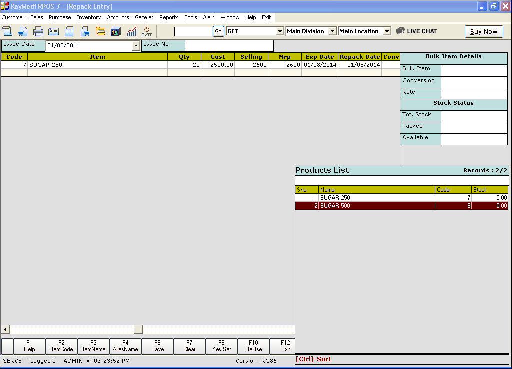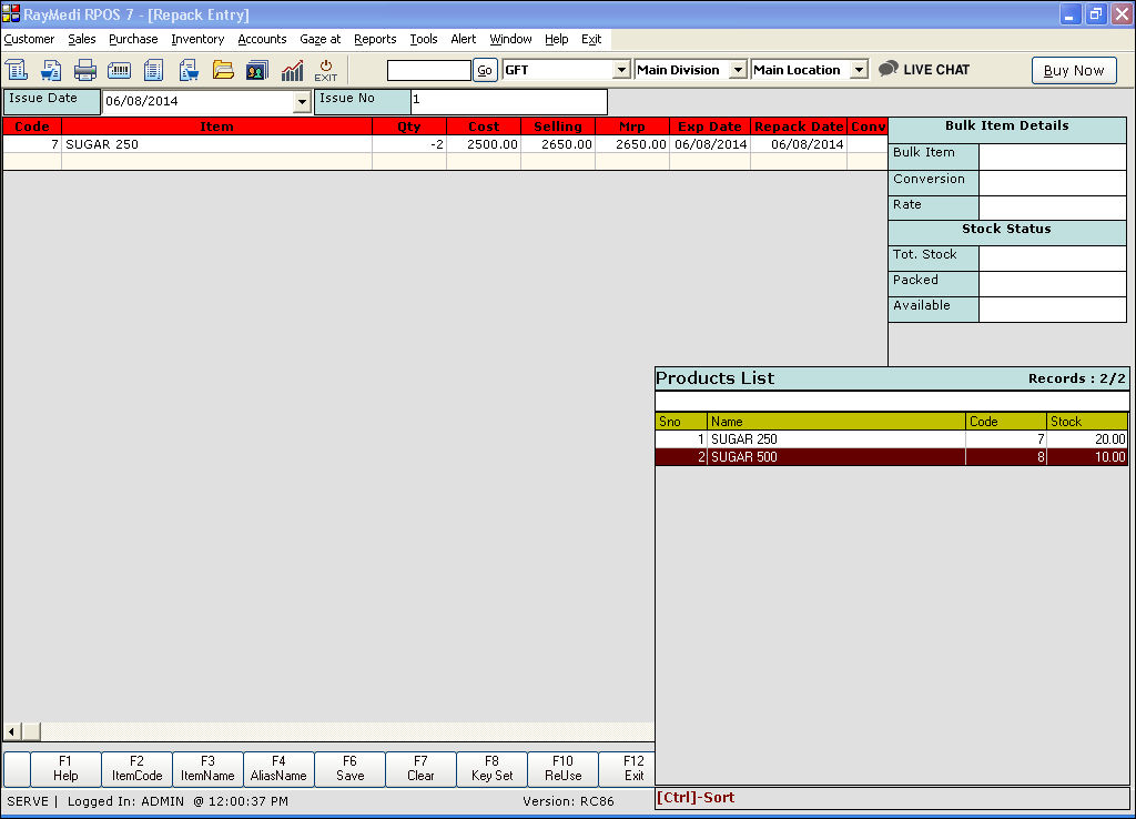 Use the Repack screen to repack the bulk item into items of smaller quantities. After repack, the stock of the bulk item get reduced and that of the repacked items will increase.
