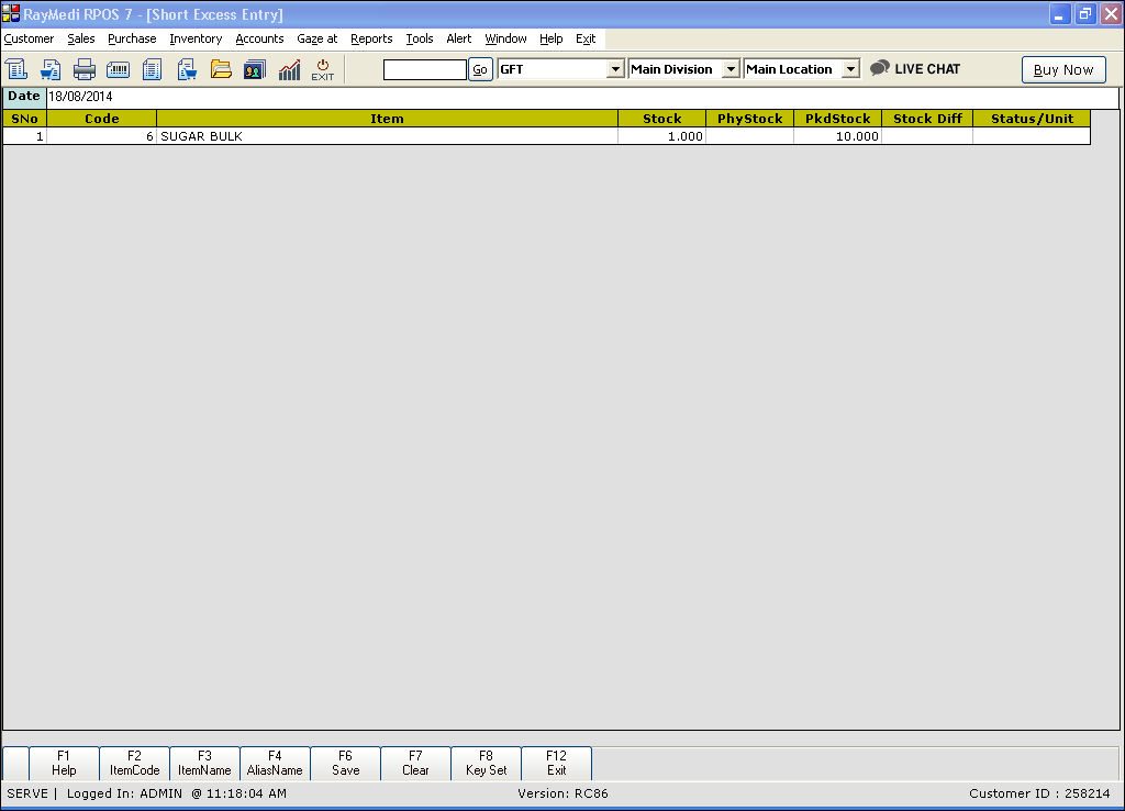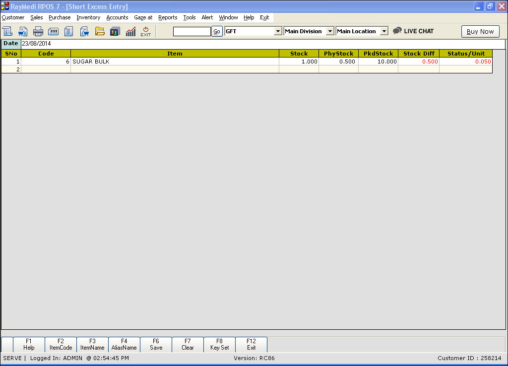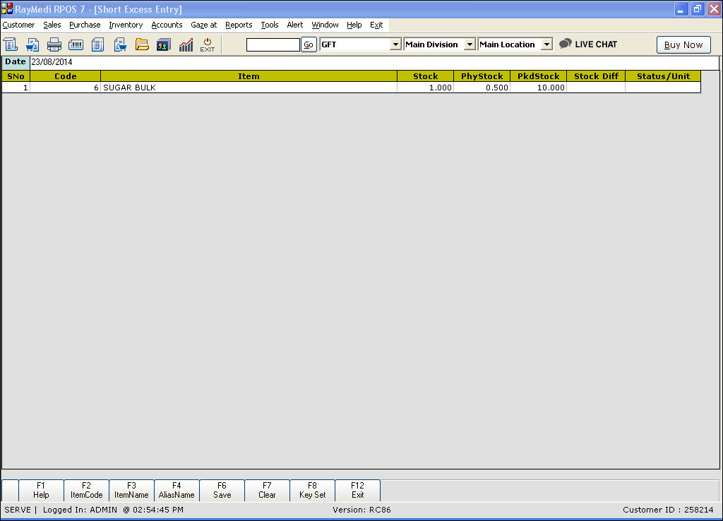 The Short Excess is useful to know the stock details of the bulk item. It helps to know the physical stock, packed stock, stock difference etc. Once the short excess is saved, the stock gets deducted.