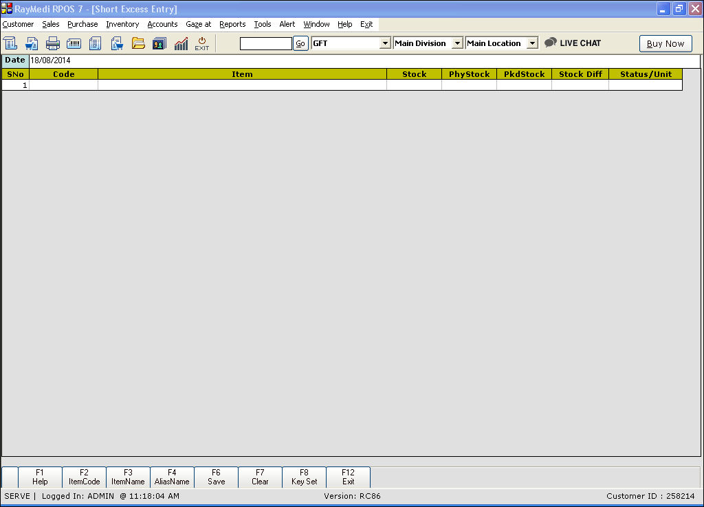1. Click Inventory >> Repack & Bulk items >> Short Excess. The Short Excess entry screen is displayed.