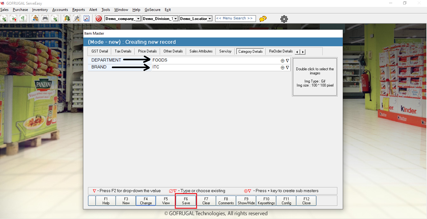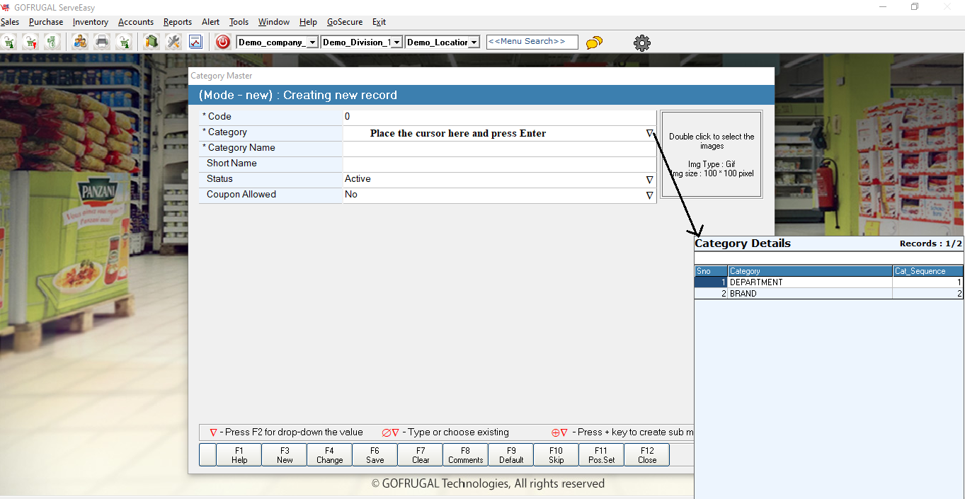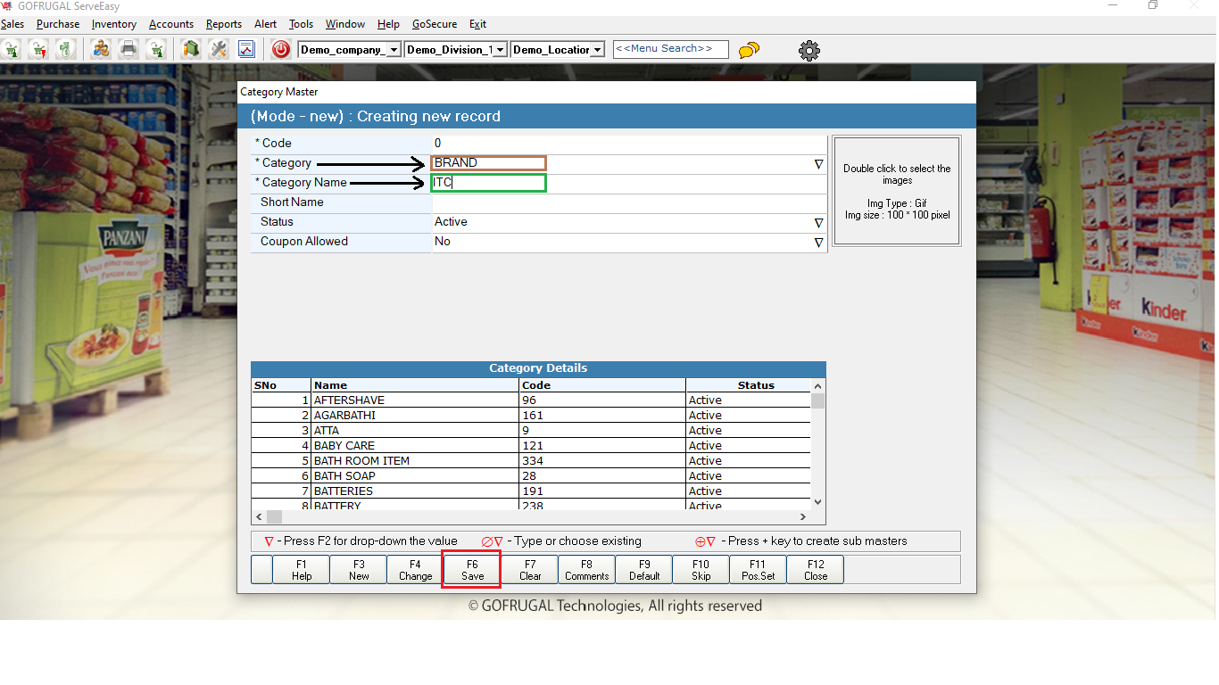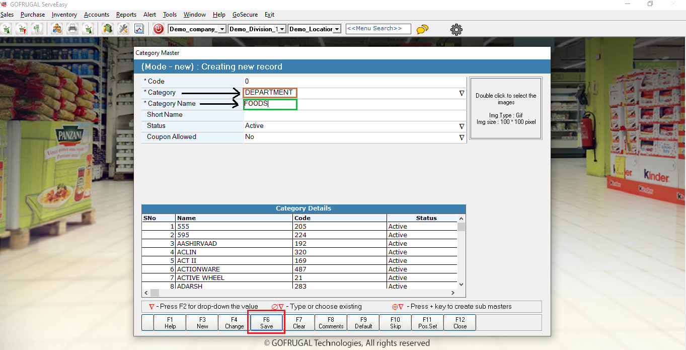 Step 4: In the Category Master dialog box, press Enter by placing the cursor in the 'Category' field. You will be able to see the main categories in the Category details popup window at the bottom left of the screen.
