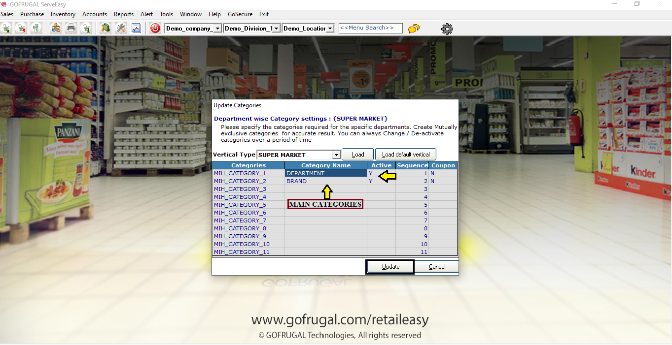 Step 2: In the "Update Categories" dialog box, enter the Main categories in the column "Category Name" and mention the status as "Y" in the "Active" column to make the category active. You can create a maximum of 10 categories. Click on "Update"