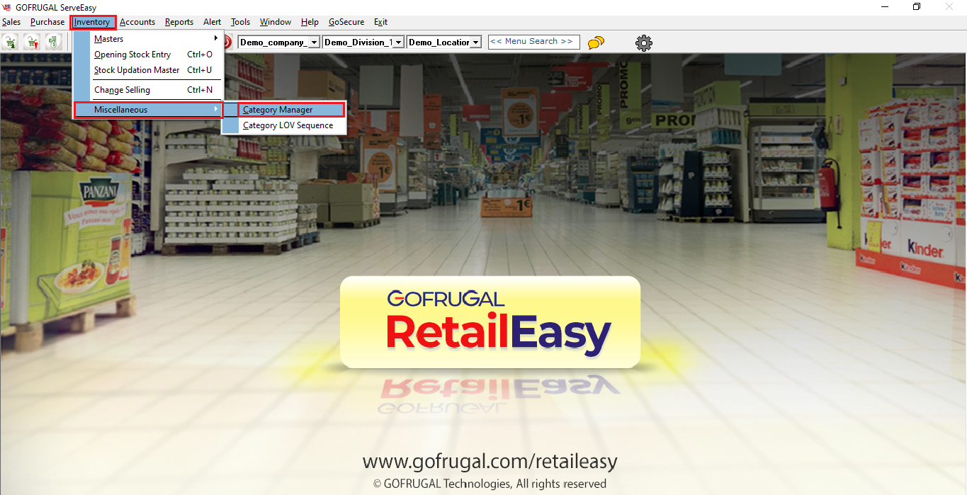 Step 1: In the RetailEasy (RPOS 6.5) screen, go to Inventory --> Miscellaneous --> Category Manager. The "Update Categories" dialog box will appear.