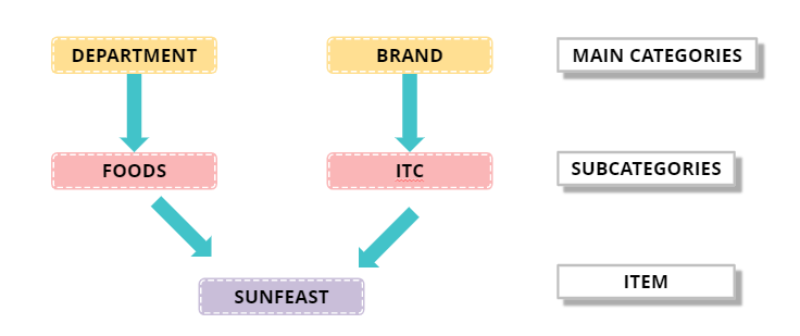 - For example, consider an example of the item 'Sunfeast' biscuit. First, we need to know the Main category. Here, 'Department' and 'Brand' are the main categories. Next out of the multiple subcategories under each main category, we need to know the subcategory for our item. The subcategories are 'Foods' under the main category 'Department' and 'ITC' under the main category 'Brand' Under these subcategories, 'Foods' and 'ITC' there will be multiple items, out which we will be able to see our item 'Sunfeast'.