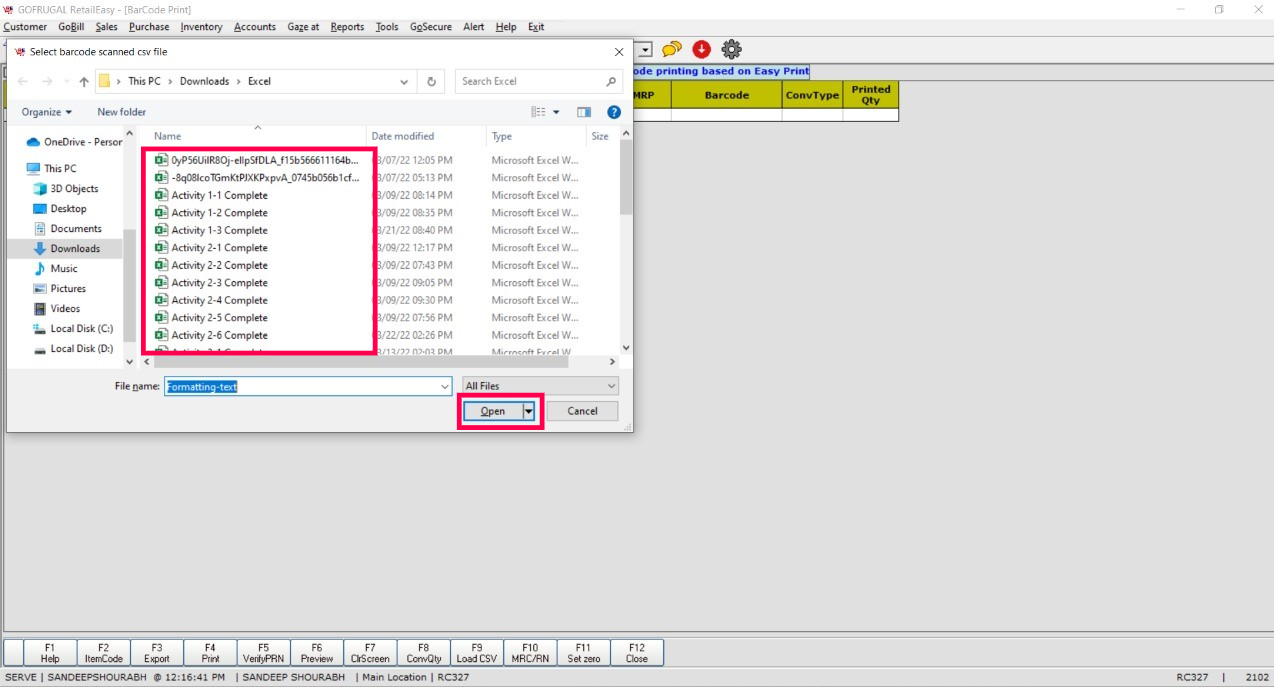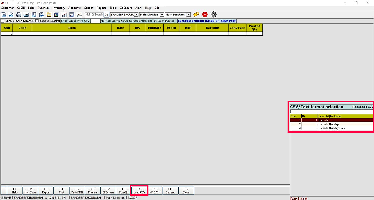 Step 2: Barcode Printing screen will appear. Choose the function key 'Load CSV' and select the Format Selection