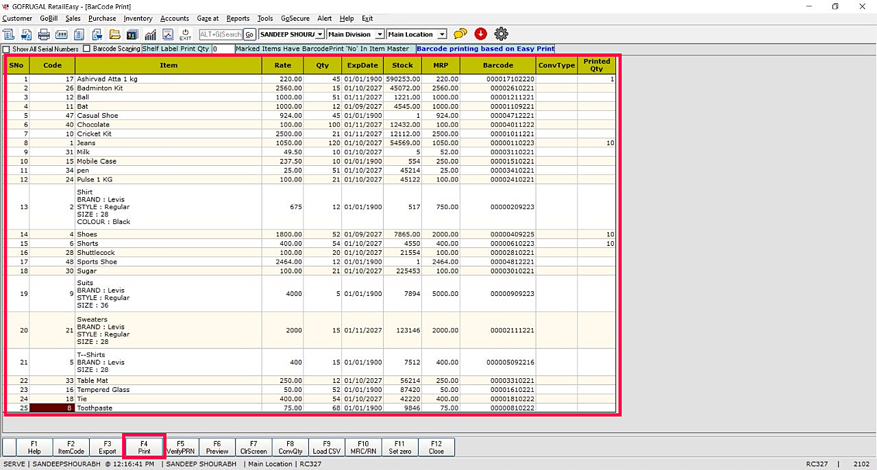 Step 4: All the listed items will reflect in the Barcode Printing screen. Select function key 'Print' to get the print of the barcode.