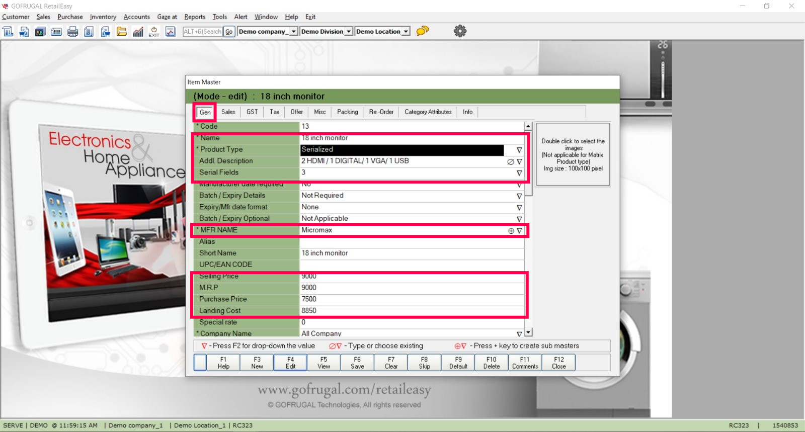 Step 2: Item Master screen will appear. In Gen tab, mention the Item Name and Choose the Product Type as Serialized from LOV. Fill the details with Add Description, Serial Fields, MFR Name, Selling Price, MRP, Purchase Price & Landing Cost.