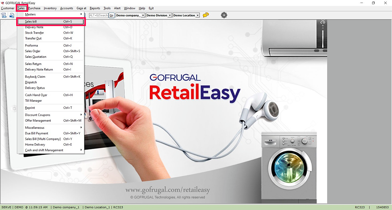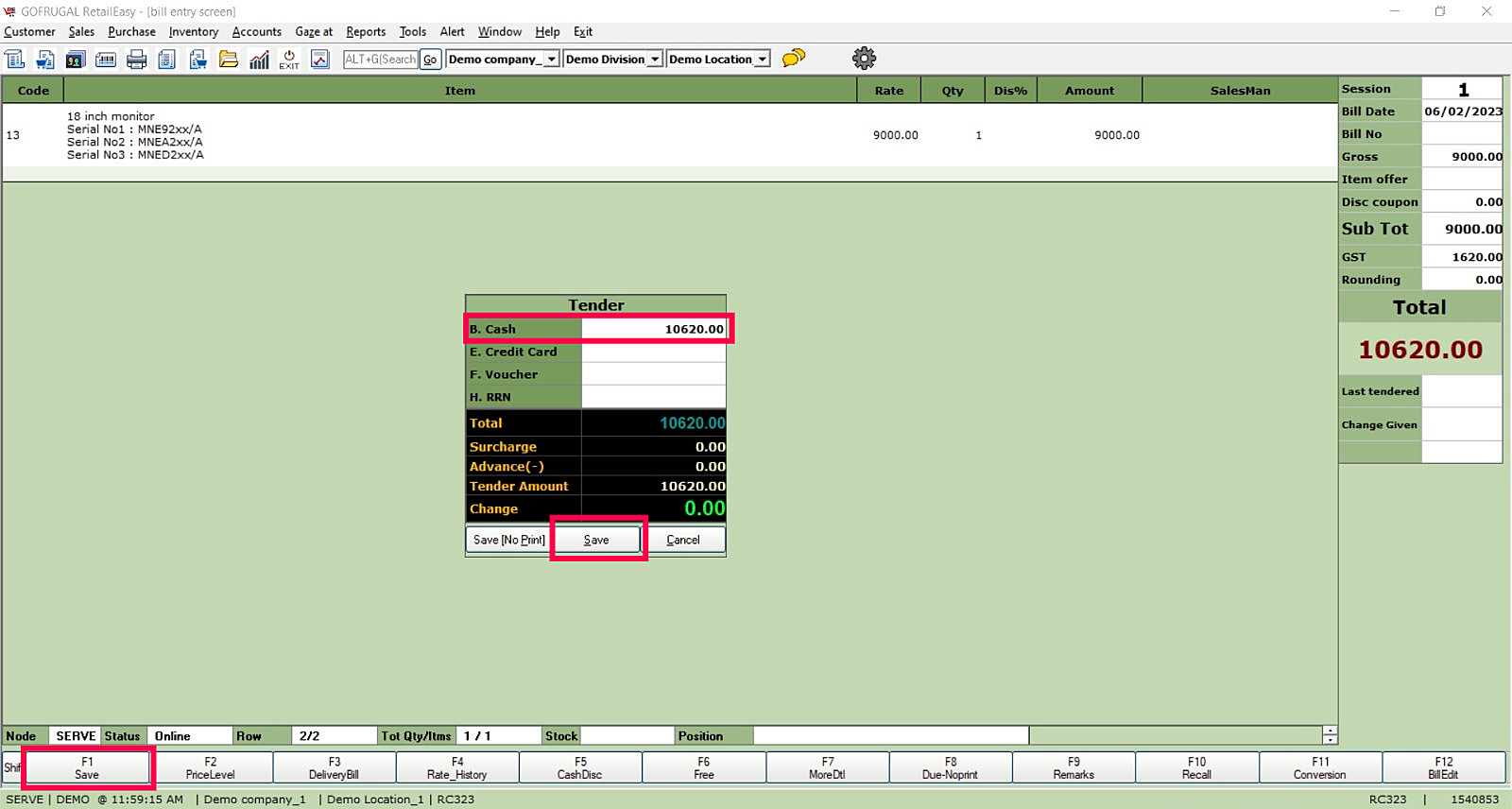 Step 8: Click the Save function key. Tender screen will appear. Select the Payment Mode as Cash and mention the amount. Click Save.
