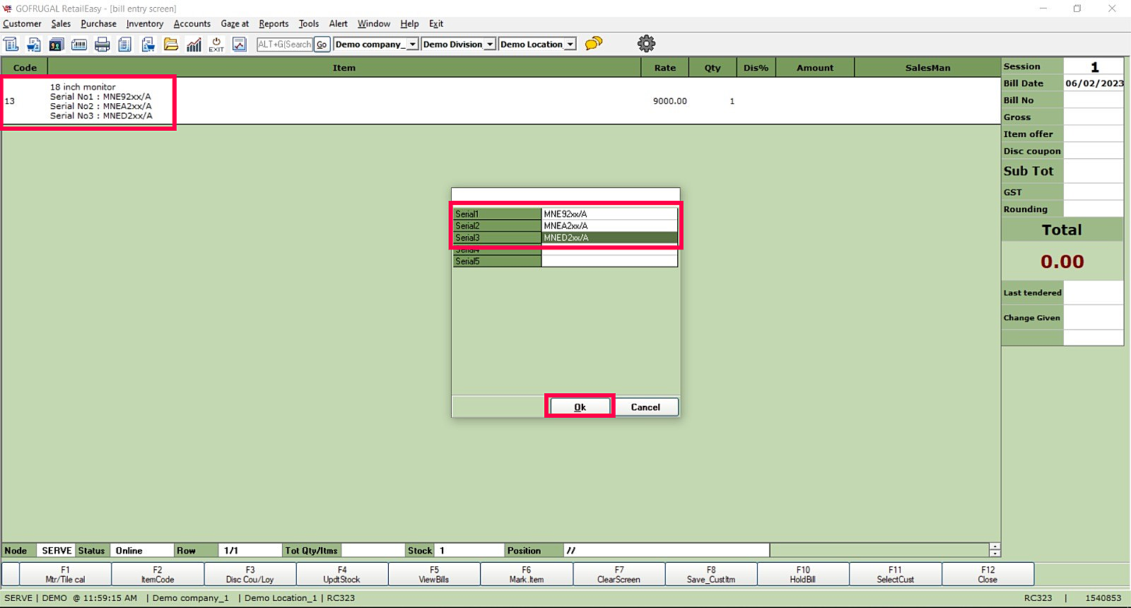 Step 5: Bill Entry Screen will appear. Load the Item and Serial Number Out Attribute tab will appear. Fill in the details with Serial Number. Click Ok.