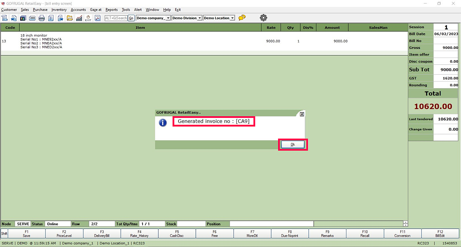 Step 9: Invoice will be generated. Note the No. and click Ok.