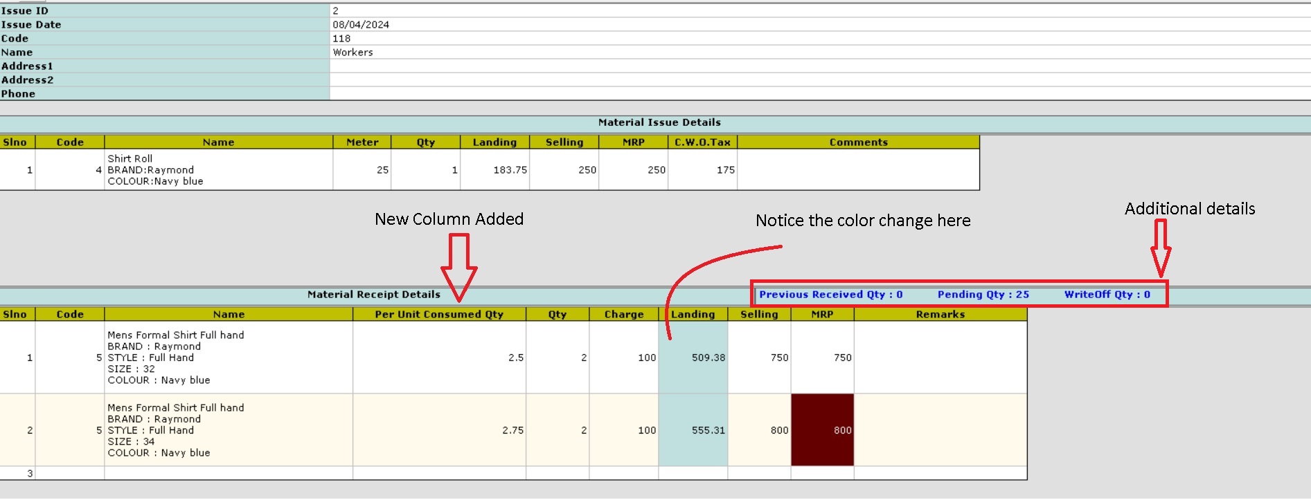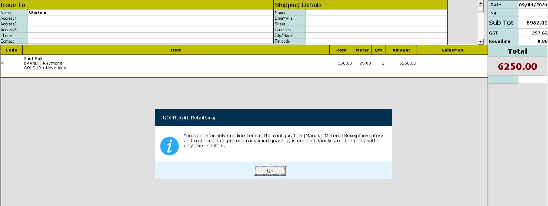 Several businesses, especially Textiles and Readymade Garments buy only the raw materials from their suppliers and supply the raw materials to workers / agencies. In turn, they get the finished goods which is further sold to the end customers. An example would be a business buying rolls of shirting / suiting or pant material and supplying the same to the workers and getting in return the finshed shirts or pants. In such business, it is important to identify how many meter of raw material were supplied and how many finshed goods could be received or was received. This is not just limited to textile business example but also applicable to many other business who supply raw material and receive back the finished goods.