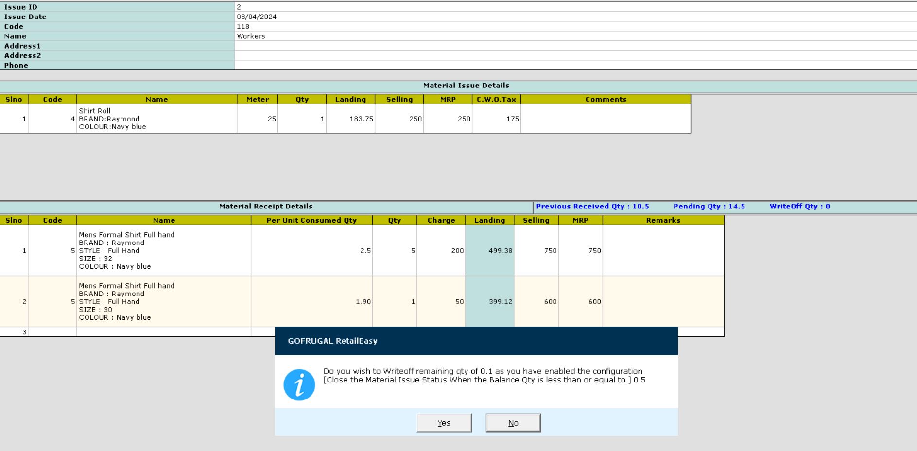 The application will prompt user with the above shown message. As we can observe, before this entry, the overall pending qty was 14.5. Slno 1 line item has consumed 12.5 qty and Slno 2 line item has consumed 1.90 leaving behind 0.25 qty. As this is less than the value given in the above configuration, the application will prompt this message and on clicking Yes, the application will write off the 0.25 qty against the issue id and mark the issue as closed.