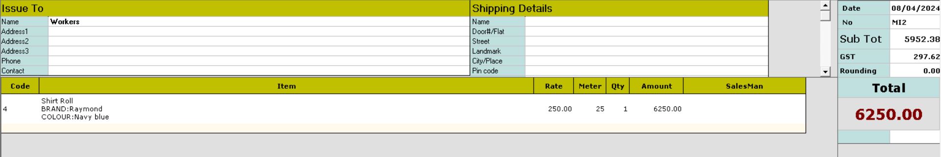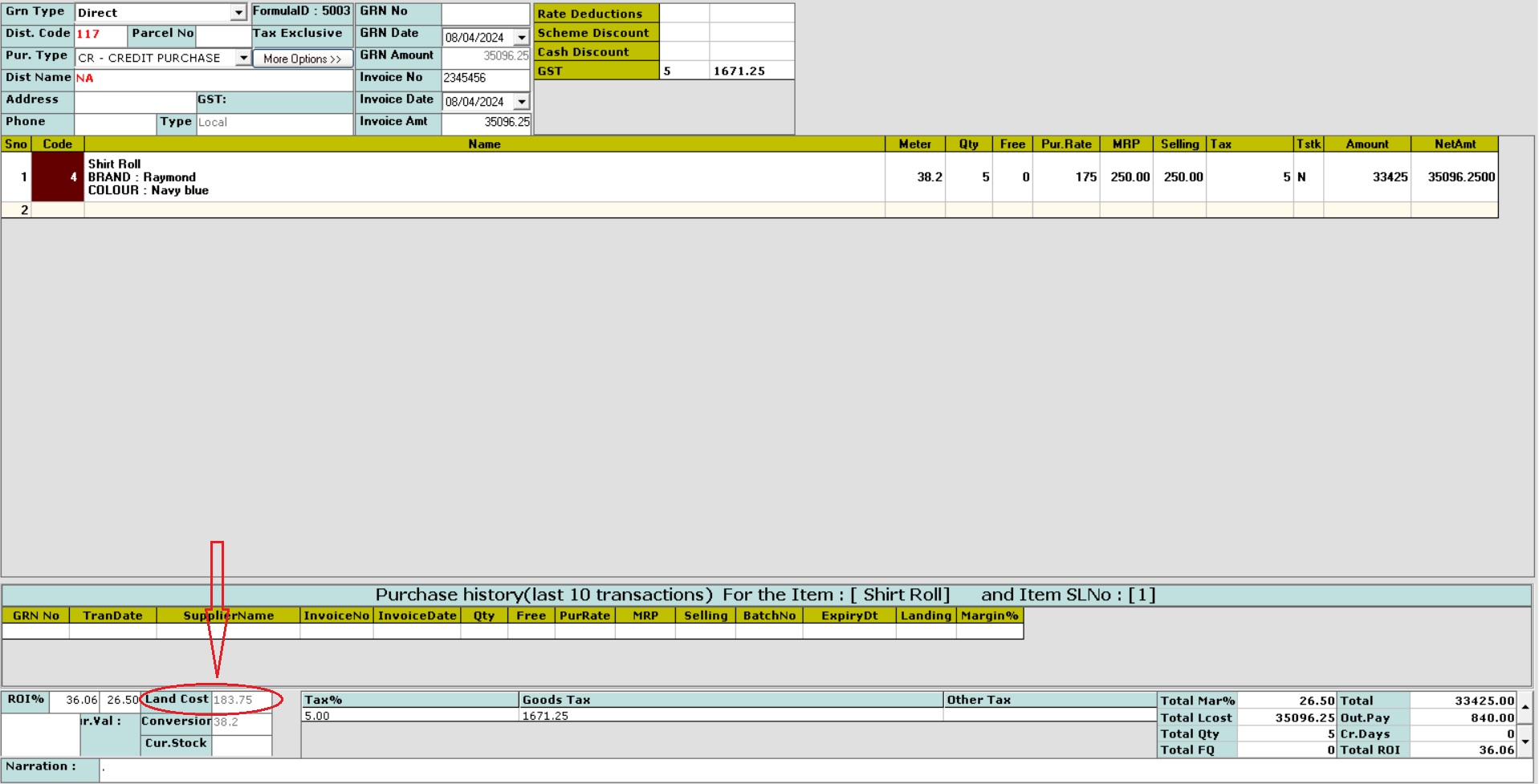 Here we have taken an example where 5 qty of 38.2 meter roll of a particular item is bought. Please see the attached purchase example. Please note that the landing cost for 1 meter for this shirt roll is 183.75