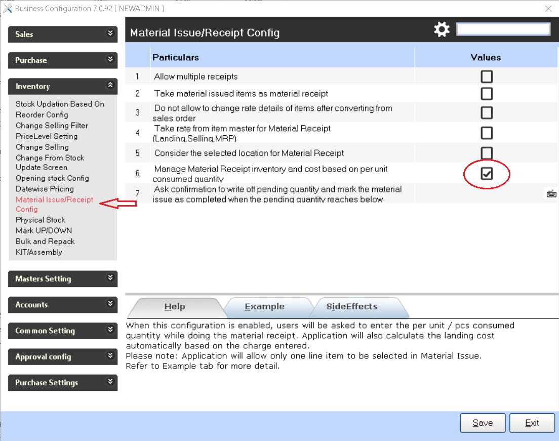 As an extension to this module we have introduced "per unit consumed" based transaction in material receipt. Let us understand this with help of an example. Before that the following steps have to be followed to configure.