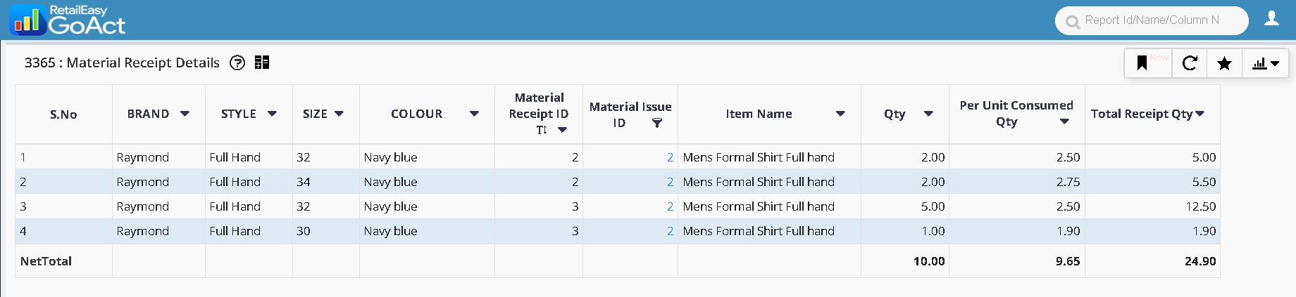 Thus, in the above case for the Slno 1 line item, we are saying that out of the 25 meter issued to the worker, in order to make a single Shirt of size 32, we require 2.5 units. In other words, we need 2.5 meter of issued item to get 1 shirt. Similarly, for the Slno 2 line item, we have entered 2.75 as consumed qty indicating that for getting a single finished shirt of size 34 the worker consume 2.75 meter of the issued item.