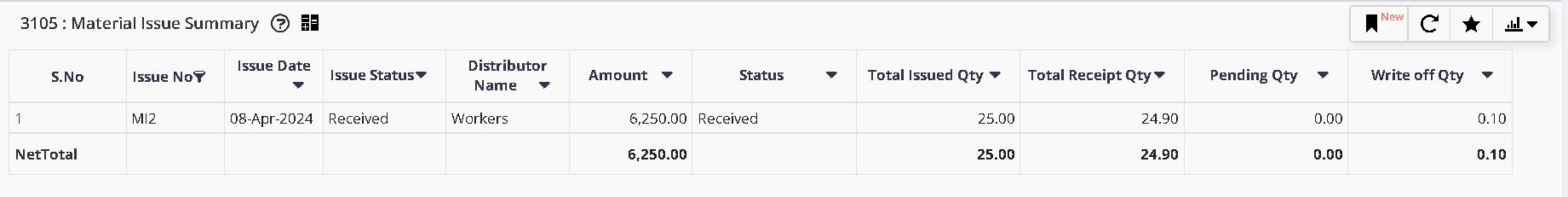 - Write off Qty: This number specifies the write off qty which the user chose to write off from the issued qty and mark the material issue as completed. Thus, that particular issue will no longer be available for further receipts.