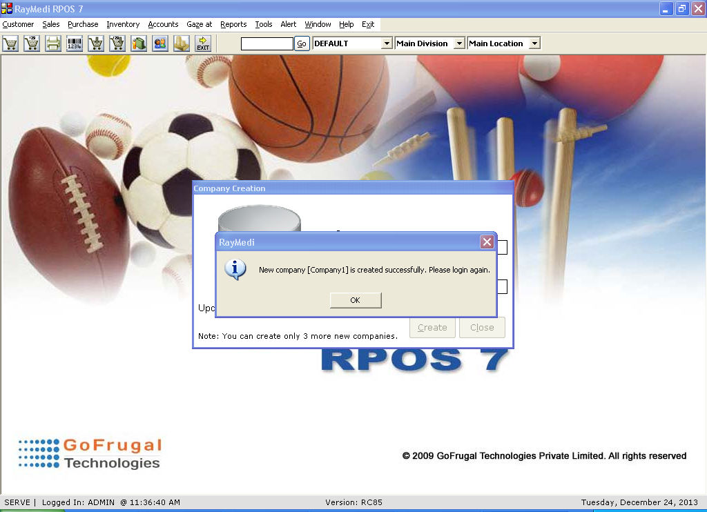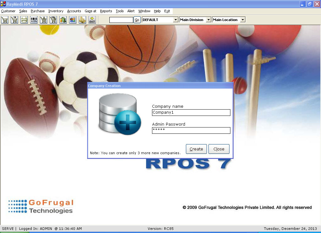 1. Create a company under Tools >> Configuration >> Create Multiple Company.