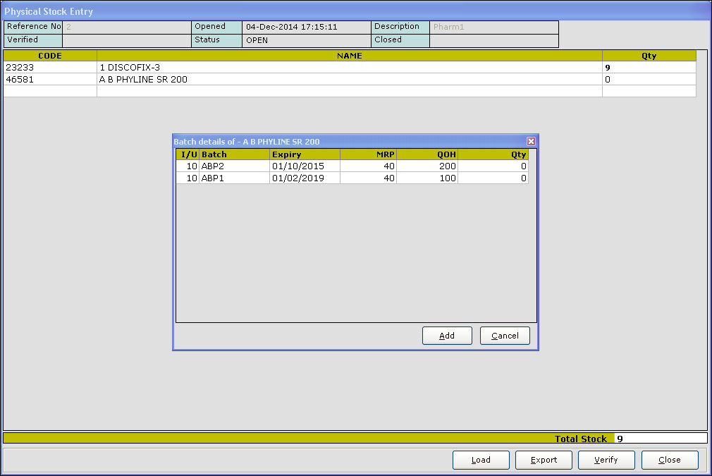 13. Click Add. The quantity is added in the Qty column of the Physical stock Entry screen.