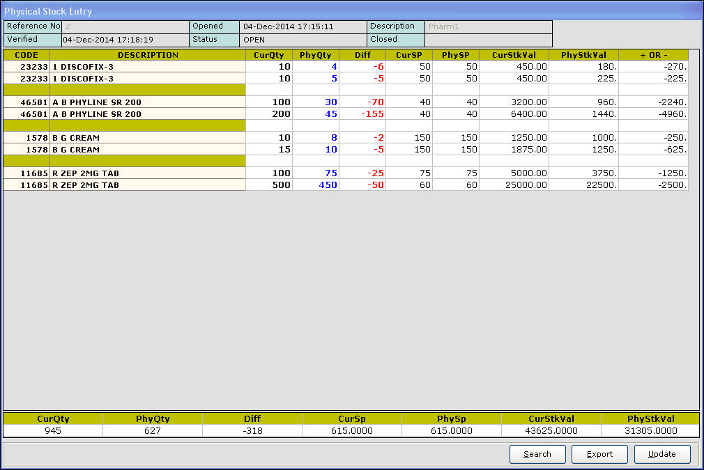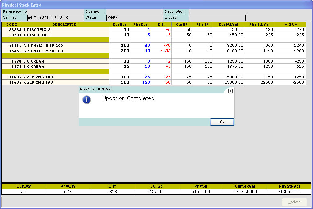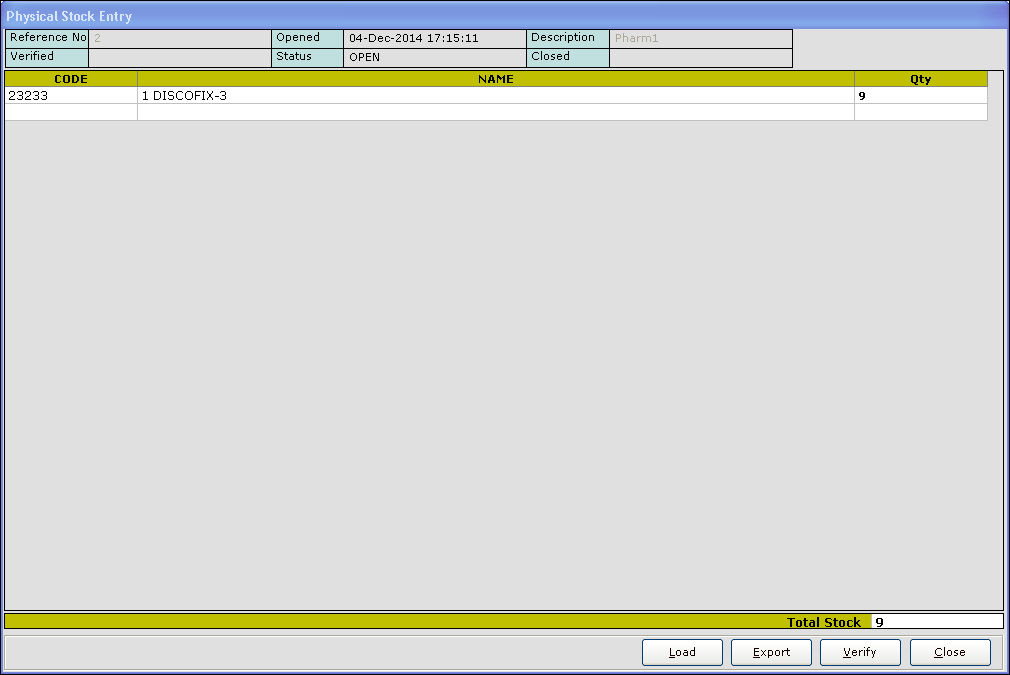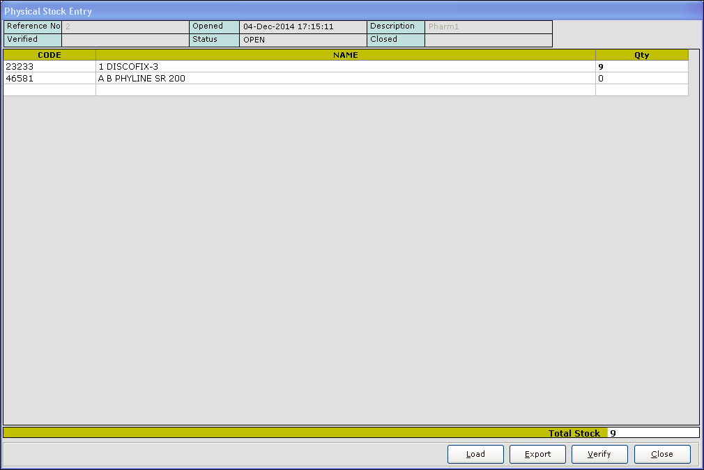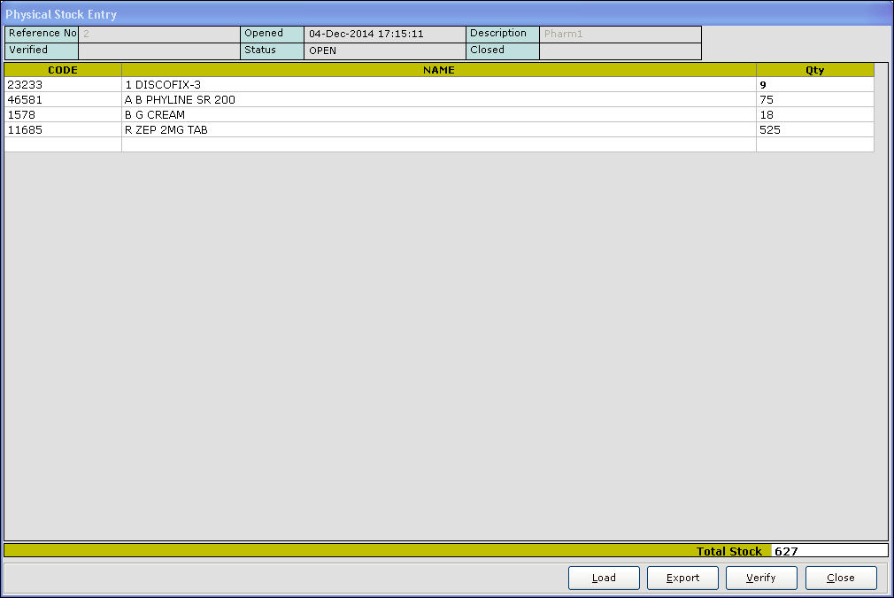 14. Similarly, load more items and click Verify. The difference between the current quantity (available in system) and physical quantity (available in hand) is displayed in the Diff column.