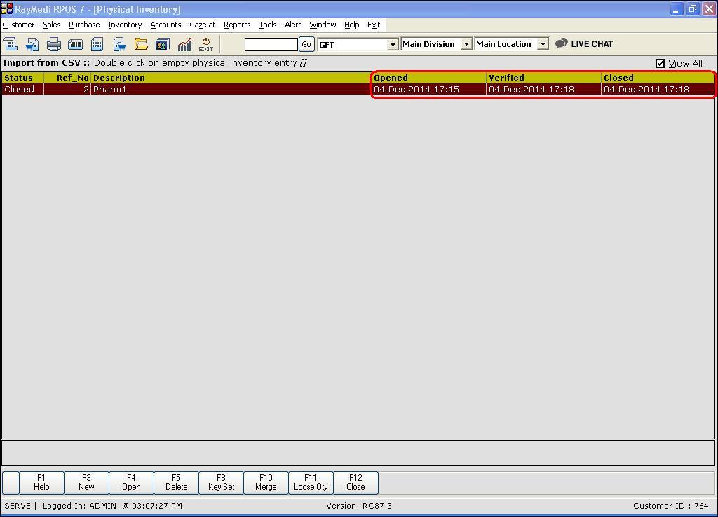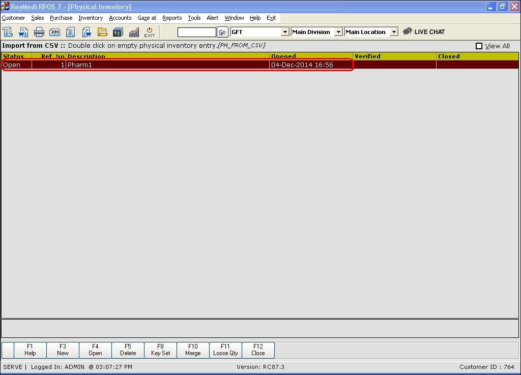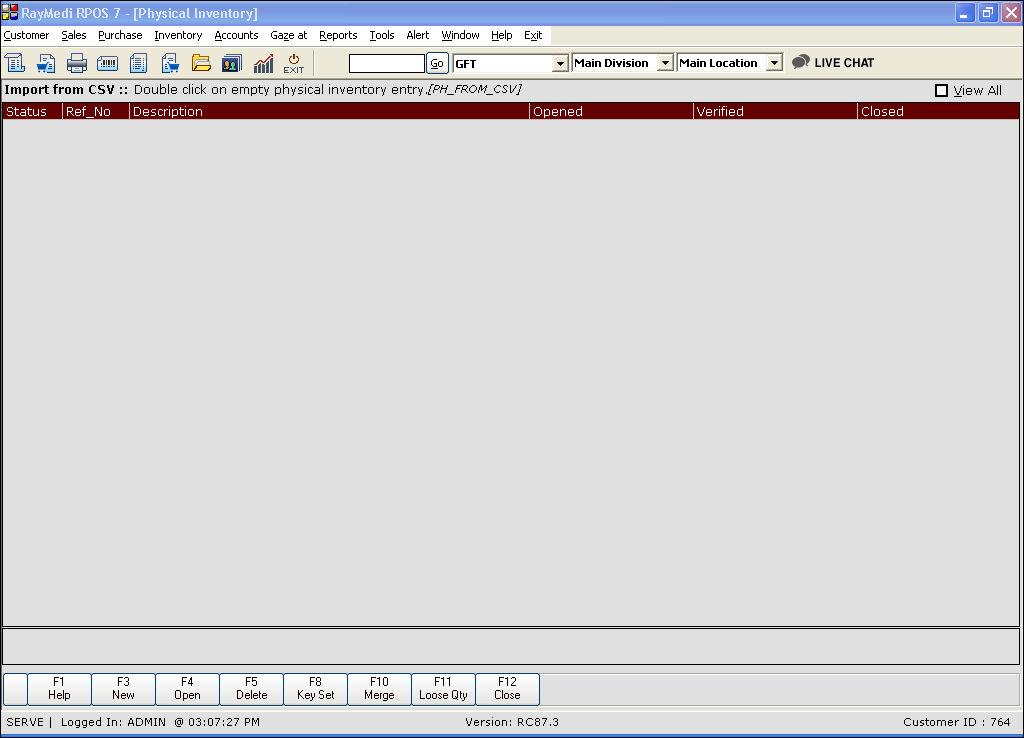 1. Click Inventory >> Physical Inventory. The Physical inventory screen is displayed.