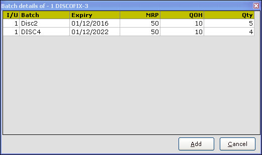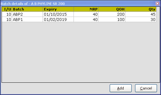 8. In the Code column, press Enter. The item LOV is displayed. Select the item from the LOV. When you place the cursor or click in the Qty column, the batch details screen for the selected item is shown in the below image is displayed.
