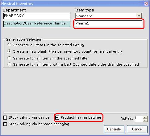 3. In the Item Typefield, select the option Standard. 4. In the Description / User Reference Number field, enter your description for the form. 5. In the Generation Selection section, the option Create a new blank physical inventory count for manual entry is selected for illustration. 6. Select the Product having batches checkbox and click Generate. A confirmation message is displayed. Click Yes. An entry for the above physical stock selection is created with a Reference number.