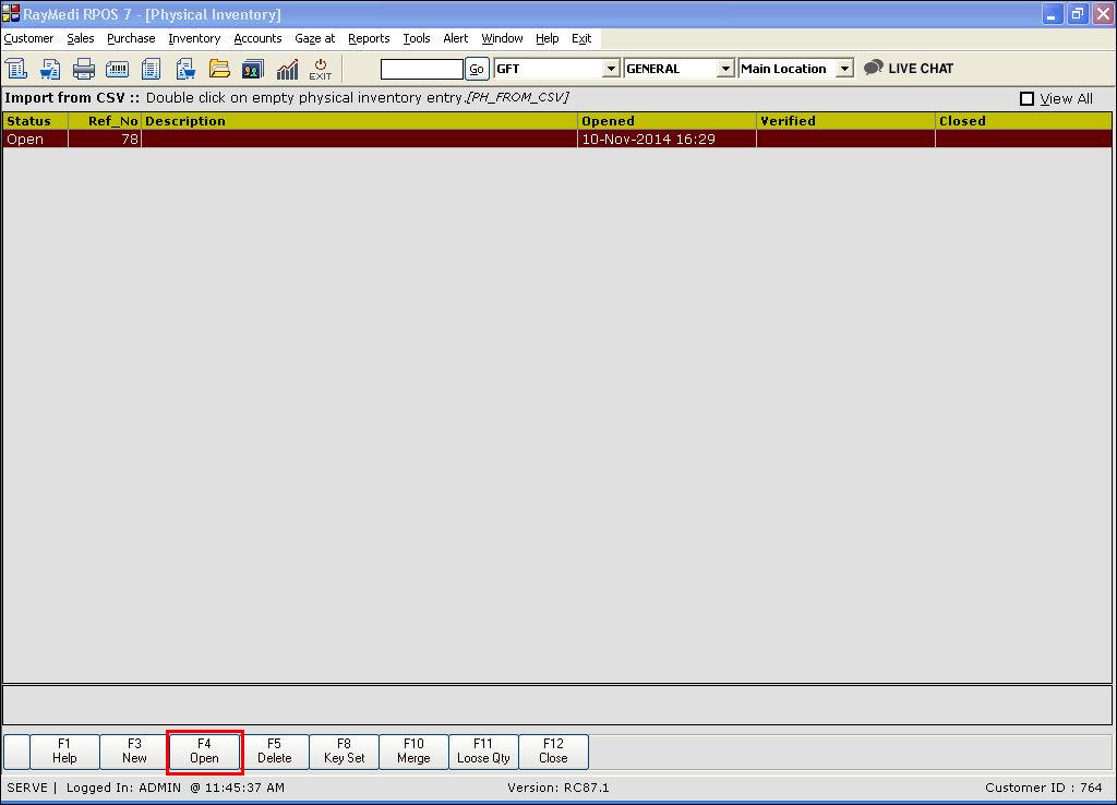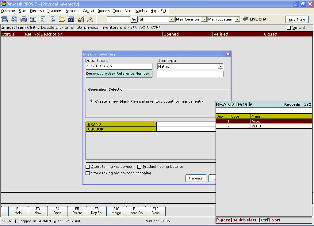 1. Click Inventory >> Physical Inventory. The Physical inventory screen is displayed.