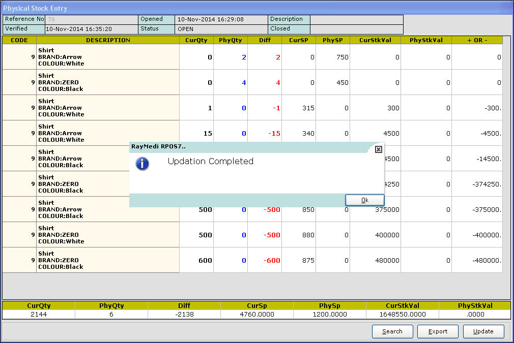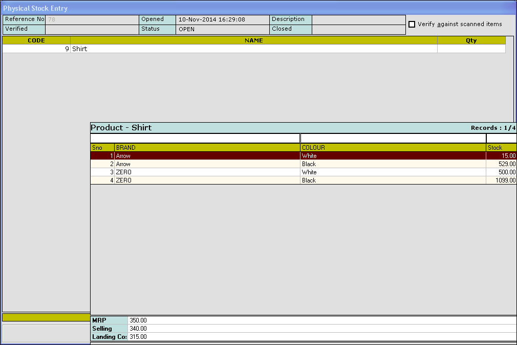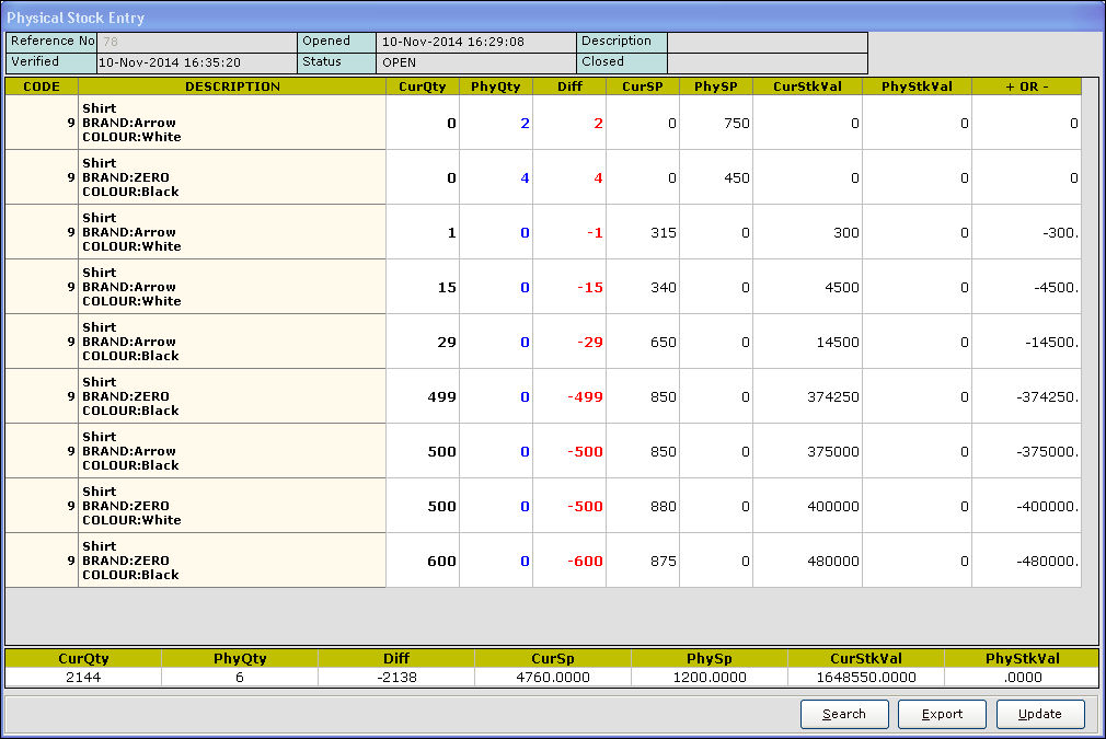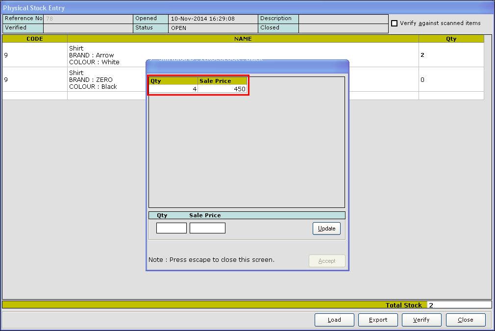 15. Press Esc key to exit. The value for the corresponding item is updated in the Physical Stock Entry screen.