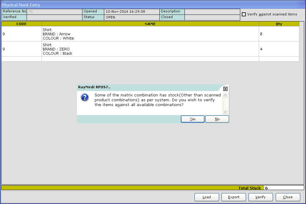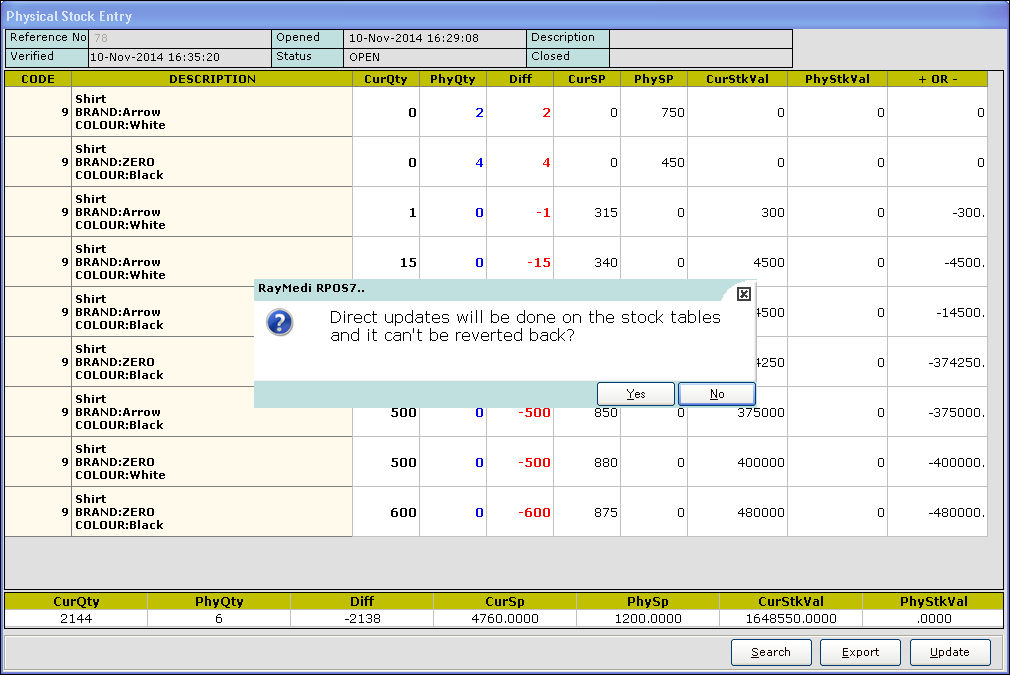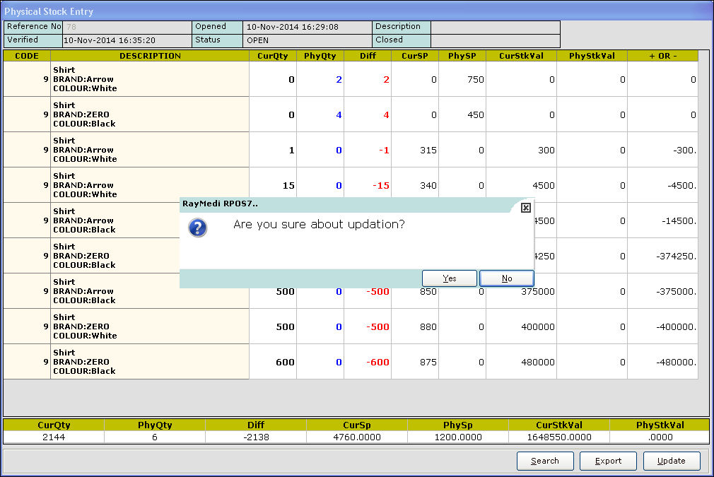 18. Click Yes. The difference between the current quantity (available in the system) and physical quantity (available in hand) is displayed in the Diff column.