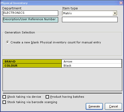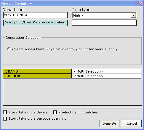 4. In the Generation Selection section, the option Create a new blank physical inventory count for manual entry is selected by default.