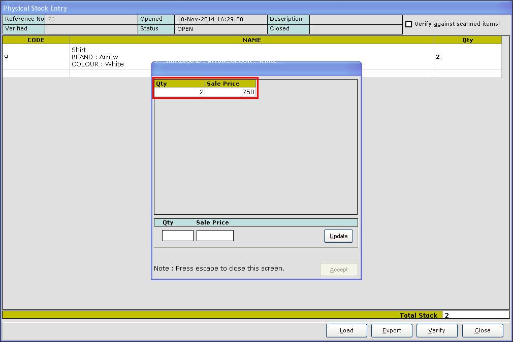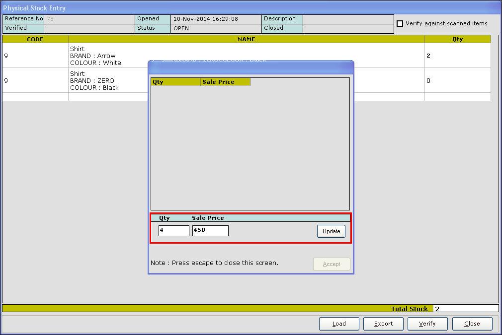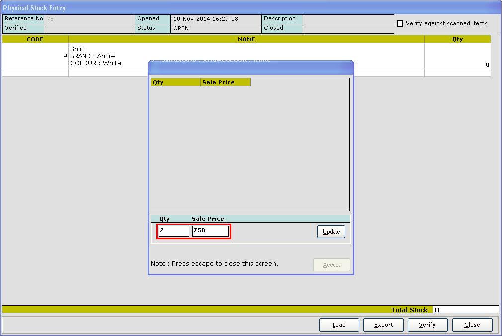 11. In the Qty column, When you place the cursor or click, the stock update screen for the respective item as shown in the below image is displayed.