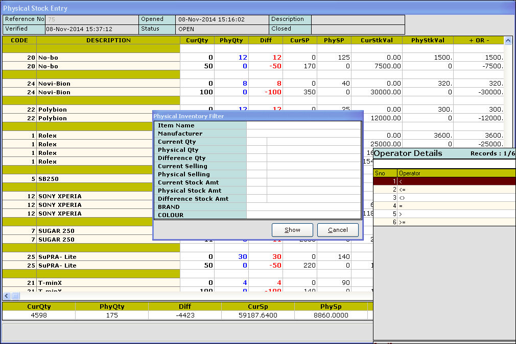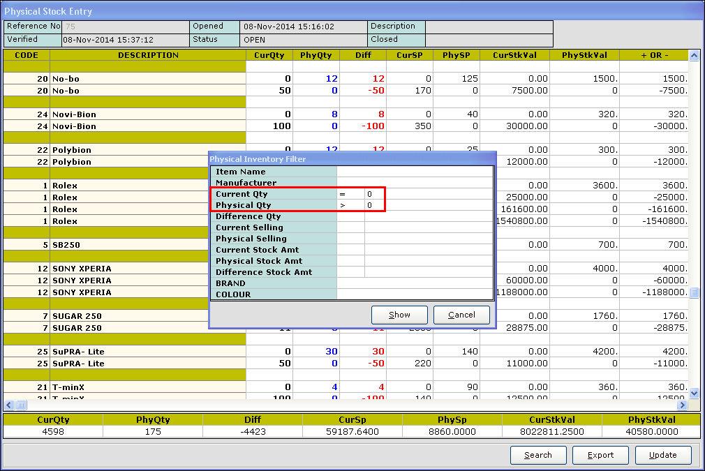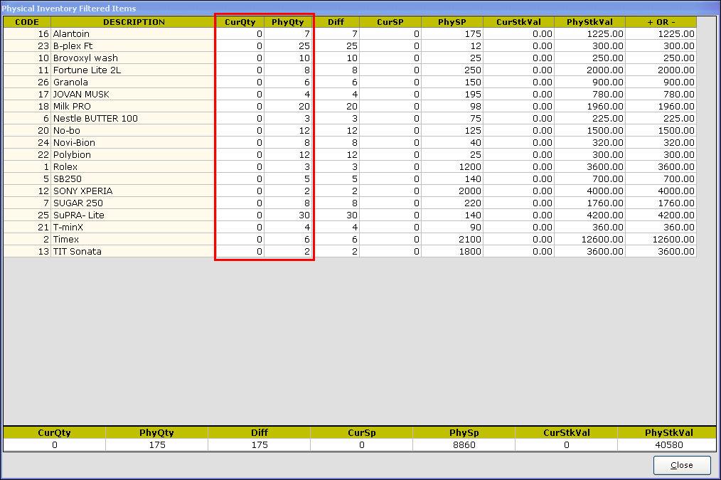 The below screen displays the details of the items with current quantity = 0 and physical quantity > 0 as selected in the filter.