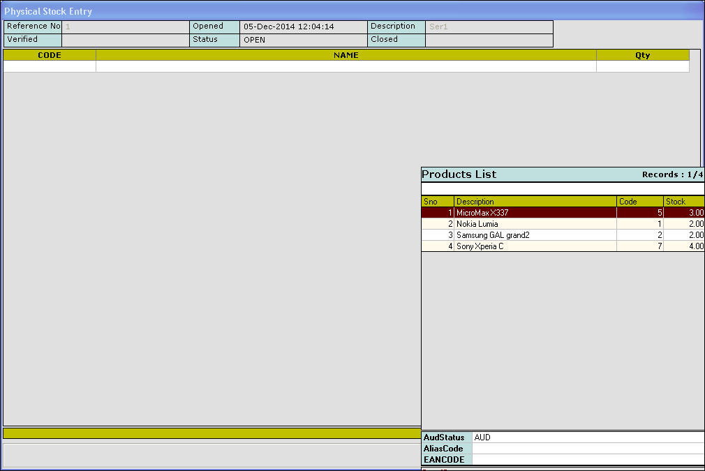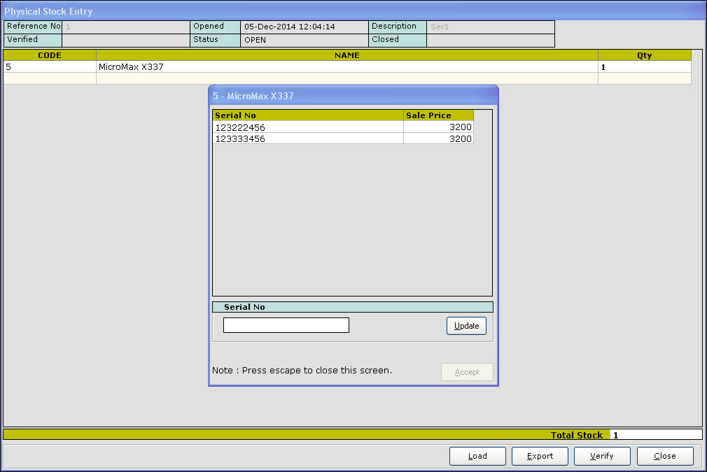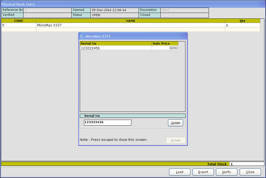 10. Press Esc key. The updated quantity is added in the Qty column of the Physical stock Entry screen.