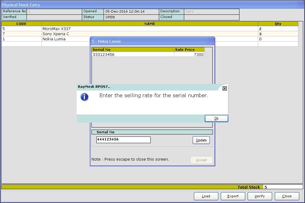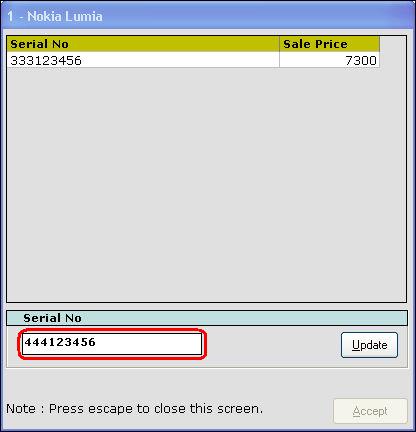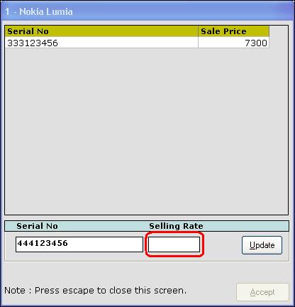 The serial number 444123456 (shown in the above image) is a new serial number. The prompt message Enter the selling rate for the serial number is displayed.