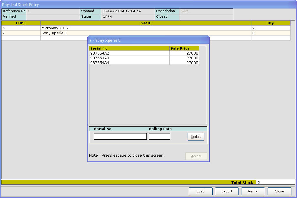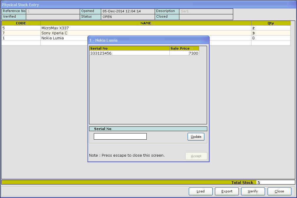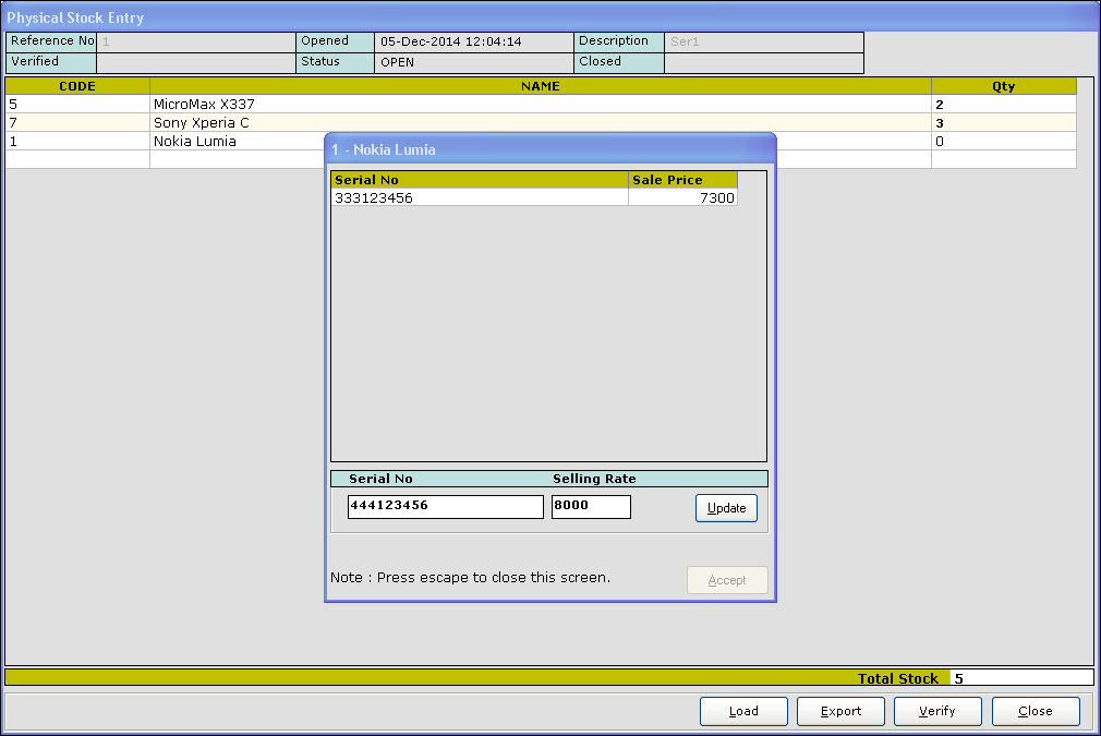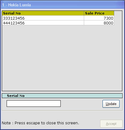 Whenever you enter a new serial number which is not stored in the application, the system prompts you to enter the selling price for the new item. This is illustrated in the below images (for the case Nokia Lumia).