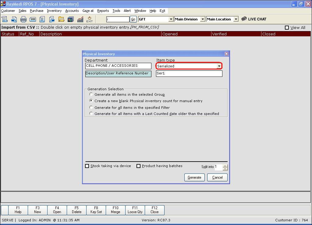 Physical inventory - Barcode scanning Use this option if you want to take the stock count by barcode scanning. This option is not available for serialised items. The steps for Standard items are illustrated below. 1. Click Inventory >> Physical ...